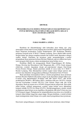 Penelitian ini dilatarbelakangi oleh kebutuhan akan bahan ajar yang menyajikan uraian materi secara lengkap dan terstruktur dalam materi Pengetahuan Dasar Pemetaan berdasarkan Tujuan Pembelajaran (TP) Kurikulum Merdeka pelajaran Geografi kelas X MAN 1 Bandar Lampung. Siswa dinilai lebih tertarik dengan bahan ajar dengan tampilan menarik dan atraktif untuk digunakan sebagai sumber belajar. Penelitian ini bertujuan untuk mengembangkan e-modul pengetahuan dasar pemetaan berbasis Heyzine Flipbook yang tervalidasi dan layak, serta menguji efektivitasnya dalam meningkatkan minat belajar siswa. Penelitian (R&D) ini menggunakan Model Pengembangan 4D (Define, Design, Develop dan Disseminate) oleh Thiagarajan dkk., (1974). Untuk menguji efektivitas e-modul, digunakan desain pre-experimental dengan One-Group Pretest-Posttest Design. Subjek penelitian adalah 22 siswa kelas X.11 MAN 1 Bandar Lampung. Data dikumpulkan melalui angket minat belajar (pretest dan posttest) dan dianalisis menggunakan perhitungan Normalized Gain (N-Gain) Hasil penelitian menunjukkan bahwa e-modul pengetahuan dasar pemetaan berbasis Heyzine Flipbook dinyatakan sangat layak digunakan sebagai bahan ajar. E-modul yang dikembangkan divalidasi oleh ahli materi (92%), ahli desain pembelajaran (90,90%), ahli bahasa (80%), penilaian oleh guru (94,43%), dengan rata-rata keseluruhan e-modul (89,33%) yaitu kriteria sangat baik dan layak digunakan. Hasil uji respon siswa (95,09%) dengan kriteria sangat baik. Dari aspek minat belajar, sebelum penggunaan e-modul, minat belajar siswa didominasi kategori rendah (54,55%) & cukup (45,45%), Setelah penggunaan e-modul, terjadi peningkatan minat belajar secara signifikan, ditunjukkan oleh nilai N-Gain rata-rata 0,70 (kategori tinggi). Peningkatan ini mengindikasikan mayoritas siswa beralih ke kategori minat belajar tinggi dan sangat tinggi. Dengan demikian, e-modul terbukti dapat meningkatkan minat belajar siswa pada materi pengetahuan dasar pemetaan. Kata kunci: pengembangan, e-modul pengetahuan dasar pemetaan, minat belajar This research is motivated by the need for teaching materials that present a complete and structured description of the material in the Basic Knowledge of Mapping material based on the Learning Objectives (TP) of the Merdeka Curriculum for Geography class X MAN 1 Bandar Lampung. Students are considered more interested in teaching materials with attractive and attractive displays to be used as learning resources. This study aims to develop a validated and feasible Heyzine Flipbook-based mapping basic knowledge e-module, and test its effectiveness in increasing student learning interest. This research (R&D) used the 4D Development Model (Define, Design, Develop and Disseminate) by Thiagarajan et al, (1974). To test the effectiveness of e-modules, a pre-experimental design with One-Group Pretest-Posttest Design was used. The research subjects were 22 students of class X.11 MAN 1 Bandar Lampung. Data were collected through questionnaire of learning interest (pretest and posttest) and analyzed using Normalized Gain (N- Gain) calculation. The results showed that the e-module of basic mapping knowledge based on Heyzine Flipbook was declared very feasible to use as teaching material. The developed e-module was validated by material experts (92%), learning design experts (90.90%), linguists (80%), assessment by teachers (94.43%), with an overall average of e-modules (89.33%) which is very good criteria and feasible to use. Student response test results (95.09%) with very good criteria. From the aspect of learning interest, before the use of e-modules, students' learning interest was dominated by the low category (54.55%) & sufficient (45.45%), after the use of e-modules, there was a significant increase in learning interest, indicated by the average N-Gain value of 0.70 (high category). This increase indicates that the majority of students shifted to the high and very high learning interest categories. Thus, e-modules are proven to be able to increase student learning interest in basic mapping knowledge material. Keywords: development, e-module basic knowledge of mapping, learning interest