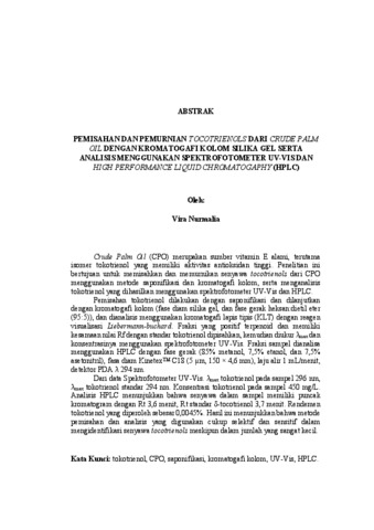 Crude Palm Oil (CPO) merupakan sumber vitamin E alami, terutama isomer tokotrienol yang memiliki aktivitas antioksidan tinggi. Penelitian ini bertujuan untuk memisahkan dan memurnikan senyawa tocotrienols dari CPO menggunakan metode saponifikasi dan kromatogafi kolom, serta menganalisis tokotrienol yang dihasilkan menggunakan spektrofotometer UV-Vis dan HPLC. Pemisahan tokotrienol dilakukan dengan saponifikasi dan dilanjutkan dengan kromatogafi kolom (fase diam silika gel, dan fase gerak heksan:dietil eter (95:5)), dan dianalisis menggunakan kromatogafi lapis tipis (KLT) dengan reagen visualisasi Liebermann-buchard. Fraksi yang positif terpenoid dan memiliki kesamaan nilai Rf dengan standar tokotrienol dipisahkan, kemudian diukur λmax dan konsentrasinya menggunakan spektrofotometer UV-Vis. Fraksi sampel dianalisa menggunakan HPLC dengan fase gerak (85% metanol, 7,5% etanol, dan 7,5% asetonitril), fasa diam KinetexTM C18 (5 μm, 150 × 4,6 mm), laju alir 1 mL/menit, detektor PDA λ 294 nm. Dari data Spektrofotometer UV-Vis. λmax tokotrienol pada sampel 296 nm, λmax tokotrienol standar 294 nm. Konsentrasi tokotrienol pada sampel 450 mg/L. Analisis HPLC menunjukkan bahwa senyawa dalam sampel memiliki puncak kromatogram dengan Rt 3,6 menit, Rt standar δ-tocotrienol 3,7 menit. Rendemen tokotrienol yang diperoleh sebesar 0,0045%. Hasil ini menunjukkan bahwa metode pemisahan dan analisis yang digunakan cukup selektif dan sensitif dalam mengidentifikasi senyawa tocotrienols meskipun dalam jumlah yang sangat kecil. Kata Kunci: tokotrienol, CPO, saponifikasi, kromatogafi kolom, UV-Vis, HPLC. Crude Palm Oil (CPO) is natural sours of vitamin E, especially tocotrienols isomers that have high antioxidant activity. This study aims to sepatared, purified and analyzed tocotrienol compounds from CPO using saponification, column chromatogaphy, and analyzed by UV-Vis spectrophotometer and HPLC. Separation of tocotrienols was carried out by saponification, followed by column chromatogaphy with silica gel as the stationary phase, and hexane:diethyl ether (95:5) as the mobile phase, analyzed by TLC using Liebermann-buchard reagent. the terpenoid fraction which have simmilar Rf with tocotrienols standard was isolated and analyzed UV-Vis spectrophotometer and HPLC with mobile phase (85% methanol, 7.5% ethanol, and 7.5% acetonitrile), KinetexTM C18 stationary phase (5 μm, 150 × 4.6 mm), flow rate 1 mL/min, PDA detector λ 294 nm. UV-Vis spectrophotometer. λmax tocotrienols measured at 296 nm (sample) and 294 nm (tocotrienols standard). Concentrations of tocotrienols in sample was 450 mg/L. HPLC analysis showed that the compound in the sample had a chromatogram peak with Rt 3.6 minutes, Rt standard δ-tocotrienol 3.7 minutes. The tocotrienols yield obtained was 0.0045%. These results indicate that the separation and analysis methods used are sufficiently, in identifying tocotrienol compounds even in very small quantities. Keywords: tocotrienols, CPO, saponification, column chromatogaphy, UV-Vis, HPLC.