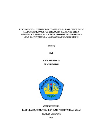 Vira , Nurmalia (2025) PEMISAHAN DAN PEMURNIAN TOCOTRIENOLS DARI CRUDE PALM OIL DENGAN KROMATOGAFI KOLOM SILIKA GEL SERTA ANALISIS MENGGUNAKAN SPEKTROFOTOMETER UV-VIS DAN HIGH PERFORMANCE LIQUID CHROMATOGAPHY (HPLC). FAKULTAS MATEMATIKA DAN ILMU PENGETAHUAN ALAM, UNIVERSITAS LAMPUNG.