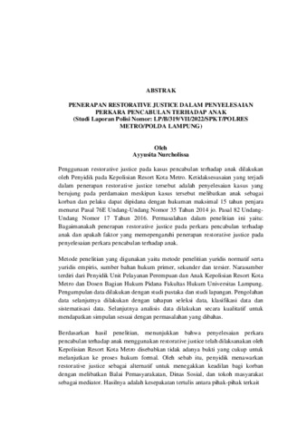 Penggunaan restorative justice pada kasus pencabulan terhadap anak dilakukan oleh Penyidik pada Kepolisian Resort Kota Metro. Ketidaksesusaian yang terjadi dalam penerapan restorative justice tersebut adalah penyelesaian kasus yang berujung pada perdamaian meskipun kasus tersebut melibatkan anak sebagai korban dan pelaku dapat dipidana dengan hukuman maksimal 15 tahun penjara menurut Pasal 76E Undang-Undang Nomor 35 Tahun 2014 jo. Pasal 82 Undang- Undang Nomor 17 Tahun 2016. Permasalahan dalam penelitian ini yaitu: Bagaimanakah penerapan restorative justice pada perkara pencabulan terhadap anak dan apakah faktor yang memepengaruhi penerapan restorative justice pada penyelesaian perkara pencabulan terhadap anak. Metode penelitian yang digunakan yaitu metode penelitian yuridis normatif serta yuridis empiris, sumber bahan hukum primer, sekunder dan tersier. Narasumber terdiri dari Penyidik Unit Pelayanan Perempuan dan Anak Kepolisian Resort Kota Metro dan Dosen Bagian Hukum Pidana Fakultas Hukum Universitas Lampung. Pengumpulan data dilakukan dengan studi pustaka dan studi lapangan. Pengolahan data selanjutnya dilakukan dengan tahapan seleksi data, klasifikasi data dan sistematisasi data. Selanjutnya analisis data dilakukan secara kualitatif untuk mendapatkan simpulan sesuai dengan permasalahan yang dibahas. Berdasarkan hasil penelitian, menunjukkan bahwa penyelesaian perkara pencabulan terhadap anak menggunakan restorative justice telah dilaksanakan oleh Kepolisian Resort Kota Metro disebabkan tidak adanya bukti yang cukup untuk melanjutkan ke proses hukum formal. Oleh sebab itu, penyidik menawarkan restorative justice sebagai alternatif untuk menegakkan keadilan bagi korban dengan melibatkan Balai Pemasyarakatan, Dinas Sosial, dan tokoh masyarakat sebagai mediator. Hasilnya adalah kesepakatan tertulis antara pihak-pihak terkait dan penerbitan surat penghentian penyelidikan. Faktor-faktor yang mempengaruhi dalam penyelesaian perkara pidana pencabulan terhadap anak menggunakan restorative justice di Kepolisian Resort Kota Metro yakni faktor perundang- undangan, faktor penegak hukum, faktor sarana dan fasilitas, faktor masyarakat serta faktor kebudayaan. Kelima faktor tersebut cenderung mendukung proses penyelesaian perkara pencabulan terhadap anak tersebut diselesaikan menggunakan restorative justice. Saran dalam penelitian ini adalah kepolisian perlu lebih selektif dalam menerapkan restorative justice dengan tetap melindungi hak korban, memastikan hukuman yang proporsional bagi pelaku, dan menggali bukti tambahan sebelum memutuskan mengedukasi masyarakat melalui sosialisasi dan seminar untuk meningkatkan pemahaman dan kepercayaan terhadap restorative justice sebagai alternatif penyelesaian pidana. Kata Kunci: Restorative Justice, Pencabulan, Anak The application of restorative justice in cases of sexual abuse against children was carried out by investigators at the Metro City Resort Police. The inconsistency in the implementation of restorative justice lies in resolving cases through mediation and peace agreements, even though the case involved a child as the victim and the perpetrator could be sentenced to a maximum of 15 years in prison under Article 76E of Law No. 35 of 2014 jo. Article 82 of Law No. 17 of 2016. The issues addressed in this research are: How is restorative justice implemented in cases of sexual abuse against children, and what factors influence the application of restorative justice in resolving such cases? This research employed normative and empirical juridical methods, utilizing primary, secondary, and tertiary legal sources. The respondents included investigators from the Women and Children Services Unit at the Metro City Resort Police and lecturers from the Criminal Law Division, Faculty of Law, University of Lampung. Data collection was conducted through literature review and field studies. The data was processed through stages of selection, classification, and systematization, followed by qualitative analysis to draw conclusions in line with the issues discussed. The research findings indicate that the resolution of cases of sexual abuse against children using restorative justice has been implemented by the Metro City Resort Police due to the lack of sufficient evidence to proceed to formal legal processes. Consequently, investigators offered restorative justice as an alternative to uphold justice for the victim by involving probation officers, social service institutions, and community leaders as mediators. The outcome was a written agreement between the parties involved and the issuance of a termination of investigation letter. The dominant factors influencing the application of restorative justice in cases of sexual abuse against children at the Metro City Resort Police include legal regulations, law enforcement, infrastructure and facilities, community perspectives, and cultural factors. These factors collectively tend to support the resolution of cases of sexual abuse against children through restorative justice. The suggestions in this study that law enforcement be more selective in applying restorative justice by prioritizing victim protection, ensuring proportional punishment for offenders, and thoroughly seeking additional evidence before making decisions. Police are encouraged to educate the public through outreach programs and seminars to enhance understanding and trust in restorative justice as an alternative dispute resolution method. The government is urged to develop comprehensive regulations as a guide for the implementation of restorative justice, ensuring harmony across legal institutions. Keywords: Restorative Justice, Sexual Abuse, Children