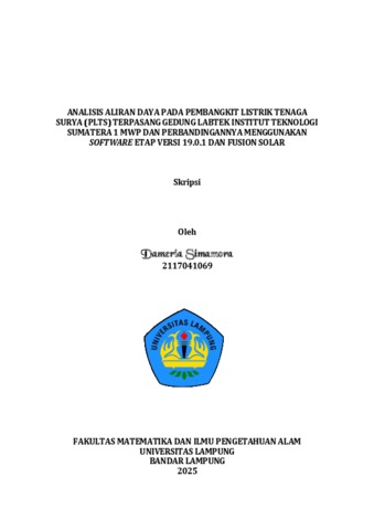 Dameria, Simamora (2025) ANALISIS ALIRAN DAYA PADA PEMBANGKIT LISTRIK TENAGA SURYA (PLTS) TERPASANG GEDUNG LABTEK INSTITUT TEKNOLOGI SUMATERA 1 MWP DAN PERBANDINGANNYA MENGGUNAKAN SOFTWARE ETAP VERSI 19.0.1 DAN FUSION SOLAR. FAKULTAS MATEMATIKA DAN ILMU PENGETAHUAN ALAM, UNIVERSITAS LAMPUNG.