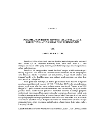 Penelitian ini bertujuan untuk mendeskripsikan perkembangan tradisi bediom di Desa Muara Jaya II, Kabupaten Lampung Barat, pada tahun 2019–2025, serta menganalisis faktor-faktor yang mempengaruhi keberlangsungan maupun perubahan dalam tradisi tersebut. Penelitian ini menggunakan metode kualitatif dengan pendekatan deskriptif, tentang bagaimana cara memahami fenomena secara mendalam. Teknik pengumpulan data dilakukan melalui wawancara dan dokumentasi, dengan teknik analisis data interaktif model Miles dan Huberman yang meliputi kondensasi data, penyajian data, serta penarikan kesimpulan. Hasil penelitian menunjukkan bahwa pelaksanaan tradisi bediom mengalami perubahan signifikan sejak pandemi COVID-19. Sebelum 2019, tradisi ini dilaksanakan dengan penuh unsur adat dan partisipasi masyarakat yang tinggi. Namun, sejak 2020 hingga 2025, pelaksanaannya semakin sederhana, bahkan cenderung ditinggalkan oleh generasi muda. Faktor-faktor penyebab perubahan meliputi masuknya pengaruh modernisasi, minimnya pelibatan generasi muda, kurangnya dokumentasi tradisi, serta lemahnya peran pemerintah dalam pelestarian budaya lokal. Meskipun demikian, masih terdapat upaya pelestarian yang dilakukan oleh tokoh adat, masyarakat, dan pemerintah desa melalui pelatihan budaya dan pendokumentasian. Penelitian ini diharapkan dapat menjadi referensi dalam pelestarian tradisi bediom sebagai bagian dari warisan budaya Lampung Saibatin. Kata Kunci: Tradisi Bediom, Perubahan Sosial, Modernisasi, Budaya Lokal, Lampung Saibatin This study aims to describe the development of the Bediom tradition in Muara Jaya II Village, West Lampung Regency, from 2019 to 2025, and to analyze the factors influencing the continuity and transformation of the tradition.The study uses a qualitative method with a descriptive approach, aiming to deeply understand the phenomenon. Data collection techniques include interviews and documentation, while data analysis employs the interactive model of Miles and Huberman, which consists of data condensation, data display, and conclusion drawing.The findings indicate that the implementation of the Bediom tradition has undergone significant changes since the COVID-19 pandemic. Prior to 2019, the tradition was carried out with strong customary elements and high community participation. However, from 2020 to 2025, the tradition has become increasingly simplified and tends to be abandoned by the younger generation.Factors contributing to this shift include the influence of modernization, limited involvement of the younger generation, lack of cultural documentation, and the weak role of the government in preserving local traditions. Nevertheless, preservation efforts are still being made by traditional leaders, the community, and the village government through cultural training and documentation.This study is expected to serve as a reference in the preservation of the Bediom Keywords: Bediom Tradition, Social Change, Modernization, Local Culture, Saibatin Lampung