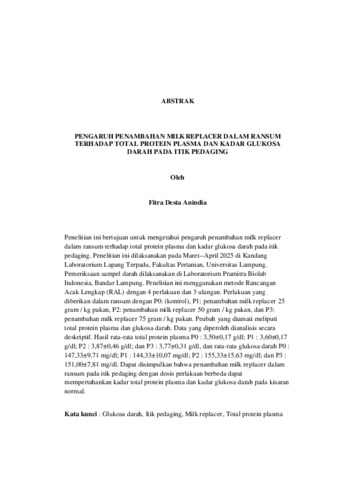 Fitra, Desta Anindia (2025) PENGARUH PENAMBAHAN MILK REPLACER DALAM RANSUM TERHADAP TOTAL PROTEIN PLASMA DAN KADAR GLUKOSA DARAH PADA ITIK PEDAGING. FAKULTAS PERTANIAN, UNIVERSITAS LAMPUNG.