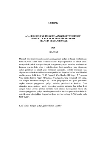Masalah penelitian ini adalah dampak penggunaan gadget terhadap pembentukan karakter peserta didik kelas iv sekolah dasar. Tujuan penelitian ini adalah untuk mengetahui apakah terdapat dampak penggunaan gadget terhadap pembentukan karakter peserta didik kelas iv sekolah dasar. Jenis penelitian yang digunakan dalam penelitian ini adalah jenis penelitian kuantitatif. Metode penelitian yang digunakan adalah korelasi berlandaskan positivistic. Populasi dalam penelitian ini adalah peserta didik kelas IV SD Negeri 1 Way Kandis, SD Negeri 2 Perumnas Way Kandis dan SD Negeri 3 Perumnas Way Kandis, yang berjumlah 187 orang. dan sampel penelitian sebanyak 65. Teknik pengumpulan data yaitu pemberian angket dampak penggunaan gadget terhadap pembentukan karakter. Data dianalisis menggunakan untuk pengujian hipotesis pertama dan kedua diuji dengan rumus korelasi product moment. Hasil analisis menunjukkan bahwa ada dampak penggunaan gadget terhadap pembentukan karakter peserta didik kelas iv sekolah dasar ditunjukkan dengan koefisien korelasi sebesar 0,706 berada pada taraf “Kuat”. Kata Kunci: dampak gadget, pembentukan karakter The problem of this research was the impact of gadget use on the character development of grade IV elementary school students. The purpose of this study was to determine whether there was an impact of gadget use on the character development of grade IV elementary school students. The type of research used in this study was quantitative research. The research method used positivistic-based correlation. The population in this study were grade IV students of SD Negeri 1 Way Kandis, SD Negeri 2 Perumnas Way Kandis and SD Negeri 3 Perumnas Way Kandis, totaling 187 people. and the research sample were 65. The data collection technique was the provision of impact of gadget use on the character. The data were analyzed using the product moment correlation formula for testing the first and second hypotheses. The results of the analysis showed that there was an impact of gadget use on the character development of grade IV elementary school students indicated by a correlation coefficient of 0.706 at the "High" level. Keywords: impact of gadgets, character development