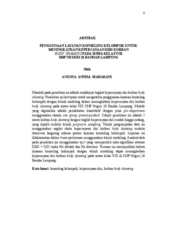ANZOYA , ANNISA MAHARANI (2025) PENGGUNAAN LAYANAN KONSELING KELOMPOK UNTUK MENINGKATKAN KEPERCAYAAN DIRI KORBAN BODY SHAMING PADA SISWA KELAS VIII SMP NEGERI 26 BANDAR LAMPUNG. FAKULTAS KEGURUAN DAN ILMU PENDIDIKAN , UNIVERSITAS LAMPUNG.