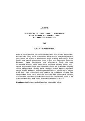 Nora Wyrentia Suhaili, - (2025) PENGARUH KEMANDIRIAN BELAJAR TERHADAP HASIL BELAJAR IPAS PESERTA DIDIK KELAS III SEKOLAH DASAR. FAKULTAS KEGURUAN DAN ILMU PENDIDIKAN, UNIVERSITAS LAMPUNG.