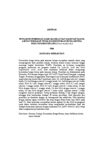 Kerontokan bunga betina pada tanaman kelapa merupakan masalah utama yang mempengaruhi hasil produksi kelapa, terutama selama musim kemarau hingga mencapai tingkat kerontokan 70-80%. Penelitian ini bertujuan mengetahui pengaruh pemberian zat pengatur tumbuh SA (salicylic acid) dan NAA (naphthalene acetic acid), serta kombinasi keduanya dalam mengurangi kerontokan bunga betina pada tanaman kelapa. Penelitian ini dilaksanakan pada Desember 2024 sampai dengan April 2025 di PT. Great Giant Pineapple, Lampung Tengah. Penelitian menggunakan Rancangan Acak Kelompok nonfaktorial (RAK) yang terdiri atas kontrol dan 9 perlakuan, yaitu: SA 2mM dengan interval 1 minggu sekali, SA 2mM dengan interval 2 minggu sekali, SA 2mM dengan interval 1 bulan sekali, NAA 0,5 ml/L dengan interval 1 minggu sekali, NAA 0,5 ml/L dengan interval 2 minggu sekali, NAA 0,5 ml/L dengan interval 1 bulan sekali, SA dan NAA dengan interval 1 minggu sekali, SA dan NAA dengan interval 2 minggu sekali, SA dan NAA dengan interval 1 bulan sekali. Aplikasi selama 2 bulan mengikuti interval perlakuan. Setiap perlakuan diulang 3 kali dengan ulangan, sehingga total keseluruhan terdapat 30 satuan percobaan. Data diperoleh dari penelitian ini dianalisis dengan uji homogenitas dan additivitas. Data dianalisis dengan analisis ragam (ANARA) dan diuji dengan Beda Nyata Jujur (BNJ) pada taraf 5%. Hasil penelitian menujukkan bahwa aplikasi SA dan NAA berpengaruh nyata dalam menekan kerontokan tetapi menghambat pertumbuhan buah dan terdapat konsentrasi optimum dengan kombinasi (SA 2mM + NAA 0,5 ml/L) tetapi tidak menghambat pertumbuhan buah. Kata kunci: Hormon, Kelapa, Kerontokan Bunga Betina, Asam Naftalena Asetat, Asam Salisilat. Button shedding in coconut plants is a major problem affecting coconut yield, particularly during the dry season, with shedding levels reaching 70–80%. This study aimed to determine the effect of applying plant growth regulators, i.e SA (salicylic acid) and NAA (naphthalene acetic acid), as well as their combination, in reducing button shedding in coconut. The research was conducted from December 2024 to April 2025 at PT. Great Giant Pineapple, Lampung Tengah. The research employed a non-factorial Randomized Complete Block Design (RCBD) consisting of a control and nine treatments: SA 2 mM with interval 1-weeks; SA 2 mM with interval 2-weeks; SA 2 mM with interval 1-months; NAA 0,5 ml/L with interval 1-weeks; NAA 0,5 ml/L with interval 2-weeks; NAA 0,5 ml/L with interval 1-months; SA and NAA with interval 1-weeks; SA and NAA with interval 2-weeks; and SA and NAA with interval 1-months. The treatments were applied over a period of two months according to their respective intervals. Each treatment was replicated three times, resulting in a total of 30 experimental units. The data obtained were analyzed using homogeneity and additivity tests. Further analysis was conducted using Analysis of Variance (ANOVA), and significant differences among treatments were tested using the Honestly Significant Difference (HSD) test at the 5% significance level. The results indicated that the application of SA and NAA had a significant effect in reducing button shedding, although it inhibited fruit growth. However, an optimum concentration was found in the combination of SA 2 mM + NAA 0,5 ml/L, which reduced button shedding without inhibiting fruit development. Keywords: Hormones, Coconut, Button Shedding, Naphthalene Acetic Acid, Salicylic Acid