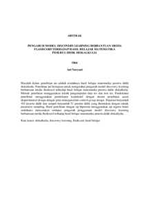 Masalah dalam penelitian ini adalah rendahnya hasil belajar matematika peserta didik diskalkulia. Penelitian ini bertujuan untuk mengetahui pengaruh model discovery learning berbantuan media flashcard terhadap hasil belajar matematika peserta didik diskalkulia. Metode penelitian menggunakan teknik pengumpulan data tes dan non tes. Pendekatan penelitian menggunakan pendekatan kuantitatif dengan desain penelitian quasi eksperimental design dengan jenis nonequivalent control group design. Populasi berjumlah 103 peserta didik dan sampel berjumlah 51 peserta didik yang ditentukan dengan teknik purposive sampling. Hasil penelitian dengan uji hipotesis menggunakan uji regresi linier sederhana menyatakan terdapat pengaruh penggunaan model discovery learning berbantuan media flashcard terhadap hasil belajar matematika peserta didik diskalkulia. Kata kunci: diskalkulia, discovery learning, flashcard, hasil belajar. The problem of this research is the low mathematics learning outcomes of dyscalculia students. This study aims to determine the effect of the discovery learning model assisted by flashcard media on the mathematics learning outcomes of dyscalculia students. The research method uses test and non-test data collection techniques. The research approach uses a quantitative approach with a quasi-experimental design research design with a nonequivalent control group design type. The population is 103 students and the sample is 51 students determined by purposive sampling technique. The results of the study with a hypothesis test using a simple linear regression test stated that there is an effect of using the discovery learning model assisted by flashcard media on the mathematics learning outcomes of dyscalculia students. Keywords: discovery learning, dyscalculia, flashcards, learning outcomes.