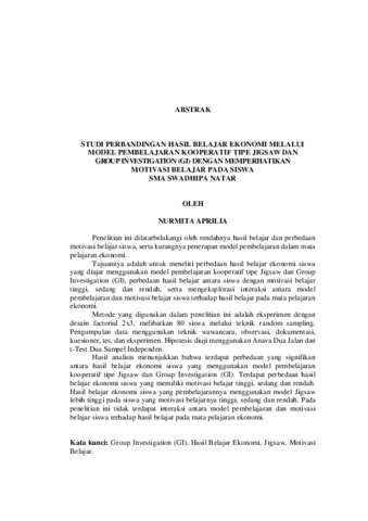 STUDI PERBANDINGAN HASIL BELAJAR EKONOMI MELALUI MODEL PEMBELAJARAN KOOPERATIF TIPE JIGSAW DAN GROUP INVESTIGATION (GI) DENGAN MEMPERHATIKAN MOTIVASI BELAJAR PADA SISWA SMA SWADHIPA NATAR