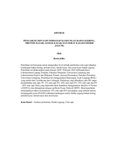 Restu , Jelita (2025) PENGARUH URIN SAPI TERHADAP KANDUNGAN BAHAN KERING, PROTEIN KASAR, LEMAK KASAR DAN SERAT KASAR FODDER JAGUNG. FAKULTAS PERTANIAN, UNIVERSITAS LAMPUNG.