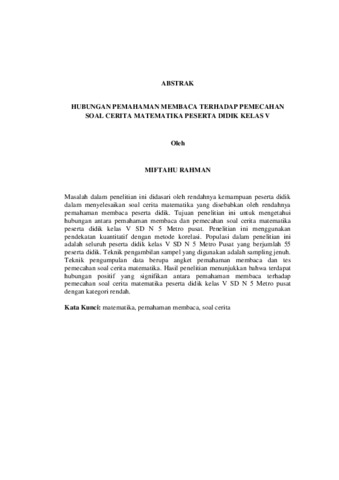 Masalah dalam penelitian ini didasari oleh rendahnya kemampuan peserta didik dalam menyelesaikan soal cerita matematika yang disebabkan oleh rendahnya pemahaman membaca peserta didik. Tujuan penelitian ini untuk mengetahui hubungan antara pemahaman membaca dan pemecahan soal cerita matematika peserta didik kelas V SD N 5 Metro pusat. Penelitian ini menggunakan pendekatan kuantitatif dengan metode korelasi. Populasi dalam penelitian ini adalah seluruh peserta didik kelas V SD N 5 Metro Pusat yang berjumlah 55 peserta didik. Teknik pengambilan sampel yang digunakan adalah sampling jenuh. Teknik pengumpulan data berupa angket pemahaman membaca dan tes pemecahan soal cerita matematika. Hasil penelitian menunjukkan bahwa terdapat hubungan positif yang signifikan antara pemahaman membaca terhadap pemecahan soal cerita matematika peserta didik kelas V SD N 5 Metro pusat dengan kategori rendah. Kata Kunci: matematika, pemahaman membaca, soal cerita The problem in this study was based on the low ability of students to solve mathematical word problems, which was caused by their poor reading comprehension. The purpose of this study was to determine the relationship between reading comprehension and the ability to solve mathematical word problems among fifth-grade students at SD N 5 Metro Pusat. This study used a quantitative approach with a correlational method. The population in this study consisted of all fifth-grade students at SD N 5 Metro Pusat, totaling 55 students. The sampling technique used total sampling. The data collection techniques included a reading comprehension questionnaire and a mathematical word problem-solving test. The results of the study showed a significant positive relationship between reading comprehension and mathematical word problem- solving ability among the fifth-grade students at SD N 5 Metro Pusat, with a low correlation category. Keywords: mathematics, reading comprehension, word problem