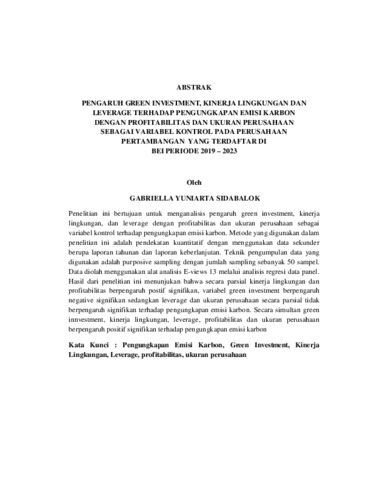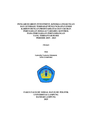 Gabriella , Yuniarta Sidabalok (2025) PENGARUH GREEN INVESTMENT, KINERJA LINGKUNGAN DAN LEVERAGE TERHADAP PENGUNGKAPAN EMISI KARBON DENGAN PROFITABILITAS DAN UKURAN PERUSAHAAN SEBAGAI VARIABEL KONTROL PADA PERUSAHAAN PERTAMBANGAN YANG TERDAFTAR DI BEI PERIODE 2019 – 2023. FAKULTAS ILMU SOSIAL DAN ILMU POLITIK, UNIVERSITAS LAMPUNG.