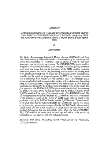 Model hybrid Vector Autoregressive Integrated Moving Average (VARIMAX) dan Long ShortTerm Memory (LSTM) merupakan pengembangan konsep peramalan data deret waktu dengan penggabungan metode statistika klasik dan deep learning dalam meningkatkan akurasi peramalan. Model hybrid VARIMAX-LSTM dirancang untuk mengatasi keterbatasan model VARIMAX dalam menangkap pola nonliner data deret waktu dan keterbatasan model LSTM dalam menangkap pola data linier secara menyeluruh. Proses peramalan melibatkan harga penutupan saham PT. Bukit Asam (PTBA) dan PT. Adaro Energi Indonesia (ADRO) sebagai variabel endogen serta nilai tukar rupiah terhadap USD sebagai variabel eksogen dengan rentang data sejak Januari 2016 hingga Desember 2024. Model hybrid VARIMAX-LSTM dibangun dengan dua pendekatan, diawali dengan prediksi dan peramalan menggunakan model VARIMAX. Hasil prediksi dan residual model VARIMAX digunakan sebagai input pada prediksi dan peramalan model hybrid. Pendekatan pertama yaitu model hybrid VARIMAX-E_LSTM yang dibangun dengan menggabungkan hasil prediksi model VARIMAX dan hasil prediksi model E_LSTM dengan input hasil residual model VARIMAX. Pendekatan kedua yaitu model hybrid VARIMAX-EP_LSTM yang merupakan penggabungan hasil prediksi model hybrid P_LSTM dengan input hasil prediksi model VARIMAX dan model E_LSTM. Hasil akhir penelitian menunjukan bahwa model hybrid VARIMAX-EP_LSTM memiliki kemampuan terbaik pada proses peramalan apabila dibandingkan dengan model VARIMAX, model LSTM individu, serta model hybrid VARIMAX-E_LSTM yang didasarkan pada nilai statistik Kolmogorov Smirnov terkecil. Sehingga, model hybrid VARIMAX-EP_LSTM merupakan model dengan kemampuan paling optimal dalam proses peramalan harga penutupan saham PTBA dan ADRO. Kata kunci: deret waktu, peramalan, hybrid VARIMAX-LSTM, VARIMAX, LSTM, saham. The Vector Autoregressive Integrated Moving Average (VARIMAX) and Long ShortTerm Memory (LSTM) hybrid model is a development of the concept of time series data forecasting by combining classical statistical methods and deep learning to improve forecasting accuracy. The VARIMAX-LSTM hybrid model is designed to overcome the limitations of the VARIMAX model in capturing nonlinear patterns of time series data and the limitations of the LSTM model in capturing linear data patterns as a whole. The forecasting process involves the closing price of PT. Bukit Asam (PTBA) and PT. Adaro Energi Indonesia (ADRO) as endogenous variables and the rupiah exchange rate against the USD as an exogenous variable with a data range from January 2016 to December 2024. The VARIMAX-LSTM hybrid model is built with two approaches, starting with prediction and forecasting using the VARIMAX model. The prediction results and residuals of the VARIMAX model are used as input for the prediction and forecasting of the hybrid model. The first approach is the VARIMAX-E_LSTM hybrid model which is built by combining the prediction results of the VARIMAX model and the prediction results of the E_LSTM model with the input of the residual results of the VARIMAX model. The second approach is the hybrid VARIMAX-EP_LSTM model which is a combination of the prediction results of the hybrid P_LSTM model with the input of the prediction results of the VARIMAX model and the E_LSTM model. The final results of the study show that the hybrid VARIMAX-EP_LSTM model has the best ability in the forecasting process when compared to the VARIMAX model, the individual LSTM model, and the hybrid VARIMAX-E_LSTM model which is based on the smallest Kolmogorov Smirnov test statistic value. Thus, the hybrid VARIMAX- EP_LSTM model is the model with the most optimal ability in the process of forecasting the closing prices of PTBA and ADRO shares. Keywords: time series, forecasting, hybrid VARIMAX-LSTM, VARIMAX, LSTM, stock market.