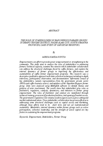 Mirna , Nanda Novita (2025) PERAN STAKEHOLDER DALAM RANGKA PEMBERDAYAAN KELOMPOK TANI DI KECAMATAN DEMPO TENGAH KOTA PAGAR ALAM PROVINSI SUMATERA SELATAN (STUDI KASUS DI GAPOKTAN BEGUYUR). Masters thesis, UNIVERSITAS LAMPUNG .