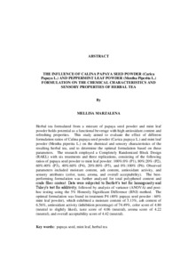 MELLISA , MARZALENA (2025) PENGARUH FORMULASI BUBUK BIJI PEPAYA CALINA (Carica papaya L.) DAN BUBUK DAUN MINT (Mentha piperita L.) TERHADAP SIFAT KIMIA DAN SENSORI TEH HERBAL. FAKULTAS PERTANIAN, UNIVERSITAS LAMPUNG.