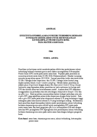 Nurul, Asyifa (2025) EFEKTIVITAS PEMBELAJARAN INKUIRI TERBIMBING BERBASIS ETNOSAINS GEREM ASEM UNTUK MENINGKATKAN KETERAMPILAN PROSES SAINS SISWA PADA MATERI ASAM BASA. FAKULTAS KEGURUAN DAN ILMU PENDIDIKAN, UNIVERSITAS LAMPUNG .
