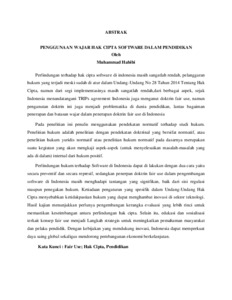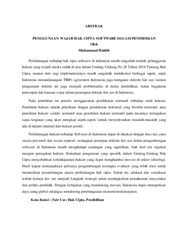 ABSTRAK Perlindungan terhadap hak cipta software di indonesia masih sangatlah rendah, pelanggaran hukum yang terjadi meski sudah di atur dalam Undang-Undang No 28 Tahun 2014 Tentang Hak Cipta, namun dari segi implementasinya masih sangatlah rendah,dari berbagai aspek, sejak Indonesia menandatangani TRIPs agreement Indonesia juga menganut doktrin fair use, namun penganutan doktrin ini juga menjadi problematika di dunia pendidikan, lantas bagaiman penerapan dan batasan wajar dalam penerapan doktrin fair use di Indonesia Pada penelitian ini penulis menggunakan pendekatan normatif terhadap studi hukum. Penelitian hukum adalah penelitian dengan pendekatan doktrinal yang bersifat normatif, atau penelitian hukum yuridis normatif atau penelitian hukum normatif pada dasarnya merupakan suatu kegiatan yang akan mengkaji aspek-aspek (untuk menyelesaikan masalah-masalah yang ada di dalam) internal dari hukum positif. Perlindungan hukum terhadap Software di Indonesia dapat di lakukan dengan dua cara yaitu secara preventif dan secara represif, sedangkan penerpan doktrin fair use dalam pengembangan software di Indonesia masih menghadapi tantangan yang signifikan, baik dari sisi regulasi maupun penegakan hukum. Ketiadaan pengaturan yang spesifik dalam Undang-Undang Hak Cipta menyebabkan ketidakpastian hukum yang dapat menghambat inovasi di sektor teknologi. Hasil kajian menunjukkan perlunya pengembangan kerangka evaluasi yang lebih rinci untuk memastikan keseimbangan antara perlindungan hak cipta. Selain itu, edukasi dan sosialisasi terkait konsep fair use menjadi Langkah strategis untuk meningkatkan pemahaman masyarakat dan pelaku pendidik. Dengan kebijakan yang mendukung inovasi, Indonesia dapat memperkuat daya saing global sekaligus mendorong pembangunan ekonomi berkelanjutan. Kata Kunci : Fair Use; Hak Cipta, Pendidikan ABSTRACT Protection of software copyrights in Indonesia is still very low, legal violations that occur despite being regulated in Law No. 28 of 2014 on Copyright, but in terms of implementation is still very low, from various aspects, since Indonesia signed the TRIPs agreement Indonesia also adheres to the doctrine of fair use, but the adherence of this doctrine is also a problem in the world of education, then how the application and reasonable limits in the application of the doctrine of fair use in Indonesia. In this research the author uses a normative approach to legal studies. Legal research is research with a doctrinal approach that is normative in nature, or normative juridical legal research or normative legal research is basically an activity that will examine aspects (to solve problems that exist within) internal of positive law. Legal protection of software in Indonesia can be done in two ways, namely preventively and repressively, while the application of the fair use doctrine in software development in Indonesia still faces significant challenges, both in terms of regulation and law enforcement. The absence of specific arrangements in the Copyright Law causes legal uncertainty that can hamper innovation in the technology sector. The study results indicate the need to develop a more detailed evaluation framework to ensure a balance between copyright protection. In addition, education and socialization related to the concept of fair use is a strategic step to increase public understanding and educators. With policies that support innovation, Indonesia can strengthen its global competitiveness while promoting sustainable economic development. Keywords: Fair Use, Copyright, Education