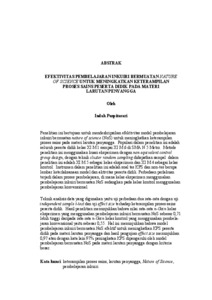 ABSTRAK Penelitian ini bertujuan untuk mendeskripsikan efektivitas model pembelajaran inkuiri bermuatan nature of science (NoS) untuk meningkatkan keterampilan proses sains pada materi larutan penyangga. Populasi dalam penelitian ini adalah seluruh peserta didik kelas XI M 1 sampai XI M 6 di SMA N 5 Metro. Metode penelitian ini menggunakan kuasi eksperimen dengan non equivalent control group design, dengan teknik cluster random sampling didapatkan sampel dalam penelitian ini adalah XI M 5 sebagai kelas eksperimen dan XI M 4 sebagai kelas kontrol. Instrumen dalam penelitian ini adalah soal tes KPS dan non-tes berupa lembar keterlaksanaan model dan aktivitas peserta didik. Perbedaan perlakuan terjadi dalam proses pembelajaran, di mana kelas eksperimen menggunakan pembelajaran inkuiri bermuatan NoS sedangkan pada kelas kontrol menggunakan pembelajaran konvensional. Teknik analisis data yang digunakan yaitu uji perbedaan dua rata-rata dengan uji independent sample t-test dan uji effect size terhadap keterampilan proses sains peserta didik. Hasil penelitian menunjukkan bahwa nilai rata-rata n-Gain kelas eksperimen yang menggunakan pembelajaran inkuiri bermuatan NoS sebesar 0,71 lebih tinggi daripada rata-rata n-Gain kelas kontrol yang menggunakan pembela- jaran konvensional yaitu sebesar 0,55. Hal ini menunjukkan bahwa model pembelajaran inkuiri bermuatan NoS efektif untuk meningkatkan KPS peserta didik pada materi larutan penyangga dan hasil pengujian effect size menunjukkan 0,97 atau dengan kata lain 97% peningkatan KPS dipengaruhi oleh model pembelajaran bermuatan NoS pada materi larutan penyangga dengan kriteria besar. Kata kunci: keterampilan proses sains, larutan penyangga, Nature of Science, pembelajaran inkuiri ABSTRACT This study aims to describe the effectiveness of the nature of science (NoS) content inquiry learning model to improve science process skills in buffer solution materials. The population in this study is all students in grades XI M 1 to XI M 6 at SMA N 5 Metro. This research method uses quasi-experiment with non equivalent control group design, with cluster random sampling technique obtain- ed samples in this study are XI M 5 as the experimental class and XI M 4 as the control class. The instruments in this study are KPS and non-test test questions in the form of model implementation sheets and student activities. The difference in treatment occurred in the learning process, where the experimental class used inquiry learning with NoS content while the control class used conventional learning. The data analysis techniques used were an average difference test with an independent sample t-test and an effect size test on students' science process skills. The results showed that the average n-Gain value of the experimental class using NoS-charged inquiry learning of 0.71 was higher than the average n- Gain of the control class using conventional defense, which was 0.55. This shows that the inquiry learning model with NoS content is effective in increasing students' KPS on buffer solution material and the effect size test results show 0.97 or in other words 97% of the increase in KPS is influenced by the NoS- loaded learning model on buffer solution material with large criteria. Keywords: buffer solutions inquiry learning, Nature of Science, science process skills
