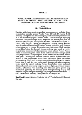 ABSTRAK Penelitian ini bertujuan untuk menganalisis penerapan strategi marketing dalam meningkatkan penjualan produk Yamaha Fazzio 125 pada PT. Lautan Teduh Interniaga Cabang Pahoman Bandar Lampung. Berdasarkan data penjualan tahun 2024, diketahui bahwa penjualan Yamaha Fazzio 125 belum mencapai target yang diharapkan. Strategi marketing mix (4P) yang terdiri dari product, price, place, dan promotion, yang bertujuan meningkatkan penjualan Yamaha Fazzio 125 pada PT. Lautan Teduh Interniaga Cabang Pahoman Bandar Lampung. Metode penelitian yang digunakan adalah deskriptif kualitatif dengan pendekatan studi lapangan melalui observasi, wawancara, dokumentasi, dan studi pustaka. Hasil penelitian menunjukkan bahwa dari keempat elemen marketing mix, aspek promotion menjadi fokus utama namun belum dijalankan secara optimal. Product Yamaha Fazzio memiliki keunggulan berupa desain modern-retro dan teknologi hybrid. Price yang ditawarkan cukup kompetitif, namun masih belum sepenuhnya menarik minat pasar. Dari sisi place distribusi dilakukan melalui showroom dan event promosi di pusat perbelanjaan, namun belum menjangkau digital marketplace secara maksimal. Untuk aspek promotion, promosi konvensional seperti pembagian brosur, stand di mall, dan event produk masih dominan, sedangkan penggunaan media sosial dan digital marketing belum dimanfaatkan secara maksimal. Rekomendasi strategi mencakup penguatan promosi digital, penyusunan program loyalitas, optimalisasi event marketing, dan diferensiasi pesan produk yang menonjolkan gaya hidup dan teknologi hybrid. Penerapan strategi 4P yang lebih inovatif diharapkan mampu mendorong peningkatan penjualan Yamaha Fazzio 125 di PT. Lautan Teduh Interniaga Cabang Pahoman secara signifikan. Kata Kunci: Strategi Marketing, Marketing Mix, 4P, Yamaha Fazzio 125, Promosi, Penjualan.