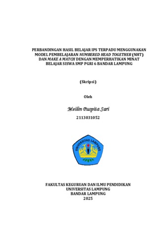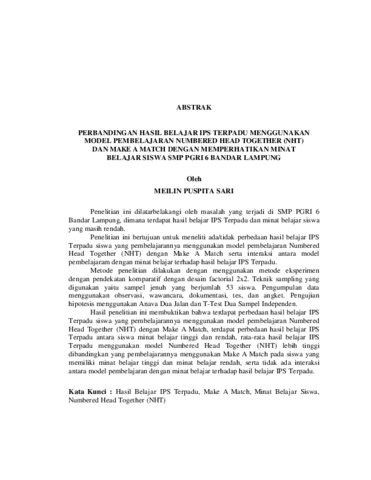 PERBANDINGAN HASIL BELAJAR IPS TERPADU MENGGUNAKAN MODEL PEMBELAJARAN NUMBERED HEAD TOGETHER (NHT) DAN MAKE A MATCH DENGAN MEMPERHATIKAN MINAT BELAJAR SISWA SMP PGRI 6 BANDAR LAMPUNG
