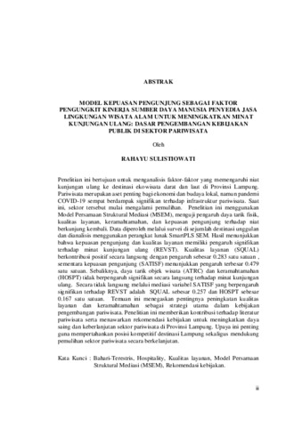 Penelitian ini bertujuan untuk menganalisis faktor-faktor yang memengaruhi niat kunjungan ulang ke destinasi ekowisata darat dan laut di Provinsi Lampung. Pariwisata merupakan aset penting bagi ekonomi dan budaya lokal, namun pandemi COVID-19 sempat berdampak signifikan terhadap infrastruktur pariwisata. Saat ini, sektor tersebut mulai mengalami pemulihan. Penelitian ini menggunakan Model Persamaan Struktural Mediasi (MSEM), menguji pengaruh daya tarik fisik, kualitas layanan, keramahtamahan, dan kepuasan pengunjung terhadap niat berkunjung kembali. Data diperoleh melalui survei di sejumlah destinasi unggulan dan dianalisis menggunakan perangkat lunak SmartPLS SEM. Hasil menunjukkan bahwa kepuasan pengunjung dan kualitas layanan memiliki pengaruh signifikan terhadap minat kunjungan ulang (REVST). Kualitas layanan (SQUAL) berkontribusi positif secara langsung dengan pengaruh sebesar 0.283 satu satuan , sementara kepuasan pengunjung (SATISF) menunjukkan pengaruh terbesar 0.479 satu satuan. Sebaliknya, daya tarik objek wisata (ATRC) dan keramahtamahan (HOSPT) tidak berpengaruh signifikan secara langsung terhadap minat kunjungan ulang. Secara tidak langsung melalui mediasi variabel SATISF yang berpengaruh signifikan terhadap REVST adalah SQUAL sebesar 0.257 dan HOSPT sebesar 0.167 satu satuan. Temuan ini menegaskan pentingnya peningkatan kualitas layanan dan keramahtamahan sebagai strategi utama dalam kebijakan pengembangan pariwisata. Penelitian ini memberikan kontribusi terhadap literatur pariwisata serta menawarkan rekomendasi kebijakan untuk meningkatkan daya saing dan keberlanjutan sektor pariwisata di Provinsi Lampung. Upaya ini penting guna mempertahankan posisi kompetitif destinasi Lampung sekaligus mendukung pemulihan sektor pariwisata secara berkelanjutan. Kata Kunci : Bahari-Terestris, Hospitality, Kualitas layanan, Model Persamaan Struktural Mediasi (MSEM), Rekomendasi kebijakan. This study aims to analyze the factors influencing revisit intention to marine and terrestrial ecotourism destinations in Lampung Province. Tourism is a vital asset for the local economy and culture; however, the COVID-19 pandemic significantly impacted tourism infrastructure. Currently, the sector is gradually recovering. This research employs the Mediated Structural Equation Modeling (MSEM) approach to examine the effects of physical attraction, service quality, hospitality, and visitor satisfaction on revisit intention. Data were collected through surveys conducted at several leading destinations and analyzed using SmartPLS SEM software. The results reveal that visitor satisfaction and service quality have a significant positive influence on revisit intention (REVST). Service quality (SQUAL) contributes directly with an effect size of 0.283, while visitor satisfaction (SATISF) shows the strongest direct effect at 0.479. In contrast, physical attraction (ATRC) and hospitality (HOSPT) do not have a significant direct impact on revisit intention. Indirectly, through the mediating variable SATISF, both SQUAL and HOSPT significantly influence REVST, with effect sizes of 0.257 and 0.167, respectively. These findings underscore the importance of enhancing service quality and hospitality as key strategies in tourism development policy. This study contributes to the tourism literature and offers policy recommendations to improve the competitiveness and sustainability of the tourism sector in Lampung Province. These efforts are crucial for maintaining Lampung’s destination competitiveness and supporting the sustainable recovery of the tourism sector. Keywords: Marine-Terrestrial, Hospitality, Service Quality, Mediated Structural Equation Modeling (MSEM), Policy Recommendation.