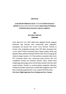 Digital Application Form (DAF) adalah sistem digitalisasi formulir pengajuan pembiayaan yang dirancang untuk mempermudah proses penginputan, penyimpanan, dan pencarian data customer secara elektronik. Penelitian ini bertujuan untuk menganalisis penerapan sistem DAF dalam penyimpanan data customer pada PT Federal International Finance Cabang Lampung. Metode yang digunakan adalah pendekatan deskriptif kualitatif melalui observasi langsung dan wawancara dengan karyawan clerk. Hasil penelitian menunjukkan bahwa sistem DAF mendukung efisiensi kerja, mempercepat proses pencarian data, serta meningkatkan keamanan dan keakuratan informasi. Namun, kendala seperti ketergantungan pada jaringan internet dan kebutuhan arsip fisik untuk audit masih menjadi hambatan. Penelitian ini merekomendasikan peningkatan infrastruktur teknologi dan pelatihan karyawan guna memaksimalkan penggunaan sistem DAF dalam mendukung pengelolaan data customer yang lebih efektif dan efisien. Kata Kunci: Digital Application Form, Penyimpanan Data, Customer. The Digital Application Form (DAF) is a digital system designed to simplify the process of inputting, storing, and retrieving customer data electronically. This study aims to analyze the implementation of the DAF system for customer data storage at PT Federal International Finance Lampung Branch. The research employed a descriptive qualitative approach through direct observation and interviews with the clerk staff. The results show that the DAF system supports work efficiency, speeds up data search processes, and improves data security and accuracy. However, there are still technical obstacles such as dependence on internet connectivity and the need to maintain physical archives for audit purposes. This study recommends improving technological infrastructure and providing employee training to maximize the use of the DAF system in supporting effective and efficient customer data management. Keywords:Digital Application Form, Data Storage, Customer.
