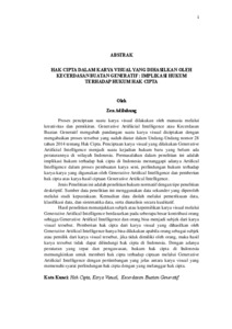 Proses penciptaan suatu karya visual dilakukan oleh manusia melalui kreativitas dan pemikiran. Generative Artifiicial Intelligence atau Kecerdasan Buatan Generatif mengubah pandangan suatu karya visual diciptakan dengan mengabaikan proses tersebut yang sudah diatur dalam Undang-Undang nomor 28 tahun 2014 tentang Hak Cipta. Penciptaan karya visual yang dilakukan Generative Artificial Intelligence menjadi suatu kejadian hukum baru yang belum ada peraturannya di wilayah Indonesia. Permasalahan dalam penelitian ini adalah implikasi hukum terhadap hak cipta di Indonesia menanggapi adanya Artifical Intelligence dalam proses pembuatan karya seni, perlindungan hukum terhadap karya-karya yang digunakan oleh Generative Artifical Intelligence dan pemberian hak cipta atas karya hasil ciptaan Generative Artifical Intelligence. Jenis Penelitian ini adalah penelitian hukum normatif dengan tipe penelitian deskriptif. Sumber data penelitian ini menggunakan data sekunder yang diperoleh melalui studi kepustakaan. Kemudian data diolah melalui pemeriksaan data, klasifikasi data, dan sistematika data, serta dianalisis secara kualitatif. Hasil penelitian menunjukkan subjek atau kepemilikan karya visual melalui Generative Artifical Intelligence berdasarkan pada seberapa besar kontribusi orang sehigga Generative Artifical Intelligence dan orang bisa menjadi subjek dari karya visual tersebut. Pemberian hak cipta dari karya visual yang dihasilkan oleh Generative Artifical Intelligence hanya bisa dilakukan apabila orang sebagai subjek atau pemilik dari karya visual tersebut, jika tidak dimiliki oleh orang, maka hasil karya tersebut tidak dapat dilindungi hak cipta di Indonesia. Dengan adanya peraturan yang tepat dan pengawasan, hukum hak cipta di Indonesia memungkinkan untuk memberi hak cipta terhadap ciptaan melalui Generative Artificial Intelligence dengan pertimbangan yang jelas antara karya visual yang memenuhi syarat perlindungan hak cipta dengan yang melanggar hak cipta. Kata Kunci: Hak Cipta, Karya Visual, Kecerdasan Buatan Generatif. The process of creating a visual work is carried out by humans through creativity and thought. Generative Artificial Intelligence or Generative Artificial Intelligence changes the view of a visual work being created by ignoring this process that has been regulated in Law number 28 of 2014 concerning Copyright. The creation of visual works carried out by Generative Artificial Intelligence is a new legal event that has not been regulated in the territory of Indonesia. The problem in this study is the legal implications of copyright in Indonesia in response to the existence of Artificial Intelligence in the process of making artworks, legal protection of works used by Generative Artificial Intelligence and the granting of copyright to works created by Generative Artificial Intelligence. This type of research is normative legal research with a descriptive research type. The data source of this study uses secondary data obtained through literature studies. Then the data is processed through data analysis, data classification, and data systematics, and analyzed qualitatively. The results of the study show that the subject or ownership of visual works through Generative Artifical Intelligence is based on how much people contribute to Generative Artifical Intelligence and people can be the subject of the visual work. The granting of copyright to a visual work produced by Generative Artifical Intelligence can only be done if a person is the subject or owner of the visual work, if it is not owned by a person, then the work cannot be protected by copyright in Indonesia. With proper regulations and supervision, copyright law in Indonesia makes it possible to copyright works through Generative Artificial Intelligence with a clear consideration between visual works that meet the requirements for copyright protection and those that infringe on copyright. Keywords: Copyright, Visual Works, Generative Artificial Intelligence.