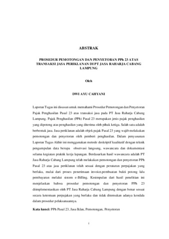 Laporan Tugas ini disusun untuk memahami Prosedur Pemotongan dan Penyetoran Pajak Penghasilan Pasal 23 atas transaksi jasa pada PT Jasa Raharja Cabang Lampung. Pajak Penghasilan (PPh) Pasal 23 merupakan jenis pajak penghasilan yang dipotong atas penghasilan yang diterima oleh pihak ketiga. Salah satu adalah berbentuk jasa. Jasa periklanan adalah objek pajak Pasal 23 yang wajib melakukan pemotongan dan penyetoran oleh pemberi penghasilan. Dalam penyusunan Laporan Tugas Akhir ini menggunakan metode deskriptif kualitatif dengan teknik pengumpulan data berupa observasi langsung, wawancara dan dokumentasi selama kegiatan praktik kerja lapangan. Berdasarkan hasil wawancara adalah PT Jasa Raharja Cabang Lampung telah melakukan pemotongan dan penyetoran PPh Pasal 23 atas jasa periklanan telah sesuai dengan peraturan perpajakan yang berlaku, mulai dari proses penerimaan invoice,pembuatan bukti potong lalu pembayaran melalui sistem e-Billing. Kesimpulan dari hasil penelitian ini menjelaskan bahwa prosedur pemotongan dan penyetoran PPh 23 diimplementasikan oleh PT Jasa Raharja Cabang Lampung dengan benar sesuai secara ketentuan perpajakan yang berlaku dan tidak ditemukan adanya kendala dalam prosedur pelaksanaannya. Kata kunci: PPh Pasal 23, Jasa Iklan, Pemotongan, Penyetoran This assignment report was prepared to understand the procedures for withholding and paying Income Tax Article 23 for service transactions at PT Jasa Raharja, Lampung Branch. Income Tax Article 23 is a type of income tax withheld from income received by third parties, one of which is in the form of services. Advertising services are subject to Article 23 tax, and the provider of the income is required to withhold and pay. This Final Assignment Report used a qualitative descriptive method with data collection techniques including direct observation, interviews, and documentation during fieldwork activities. Based on the interviews, PT Jasa Raharja, Lampung Branch, has withheld and paid Income Tax Article 23 for advertising services in accordance with applicable tax regulations, starting from the invoice receipt process, creating withholding receipts, and then payment through the e-Billing system. The conclusion of this study is that the withholding and remittance procedures for Article 23 Income Tax (PPh) were implemented correctly by PT Jasa Raharja, Lampung Branch, in accordance with applicable tax regulations, and no obstacles were found. Keywords: Article 23 Income Tax, Advertising Services, Withholding, Remittance