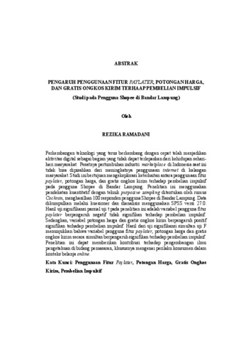 Rezika , Ramadani (2025) PENGARUH PENGGUNAAN FITUR PAYLATER, POTONGAN HARGA, DAN GRATIS ONGKOS KIRIM TERHAAP PEMBELIAN IMPULSIF (Studi pada Pengguna Shopee di Bandar Lampung). FAKULTAS ILMU SOSIAL DAN ILMU POLITIK, UNIVERSITAS LAMPUNG.