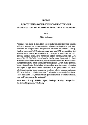 Rizky, Maharani (2025) INISIATIF LEMBAGA SWADAYA MASYARAKAT TERHADAP PENURUNAN LUAS RUANG TERBUKA HIJAU DI BANDAR LAMPUNG. FAKULTAS ILMU SOSIAL DAN ILMU POLITIK, UNIVERSITAS LAMPUNG .