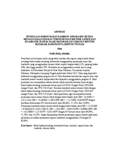 Daffa , Rizky Alhafidz (2025) PENDUGAAN BOBOT BADAN KAMBING JAWARANDU BETINA MENGGUNAKAN UKURAN TUBUH DENGAN METODE LINIER DAN KUADRATIK DI DESA FAJAR MATARAM, KECAMATAN SEPUTIH MATARAM, KABUPATEN LAMPUNG TENGAH. PERTANIAN, UNIVERSITAS LAMPUNG .