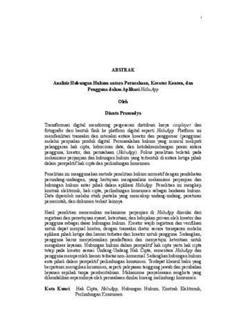 Transformasi digital mendorong pergeseran distribusi karya cosplayer dan fotografer dari bentuk fisik ke platform digital seperti HaluApp. Platform ini memfasilitasi transaksi dan interaksi antara kreator dan penggemar (pengguna) melalui penjualan produk digital. Permasalahan hukum yang muncul meliputi pelanggaran hak cipta, kebocoran data, dan ketidakseimbangan posisi antara pengguna, kreator, dan perusahaan (HaluApp). Fokus penelitian terletak pada mekanisme perjanjian dan hubungan hukum yang terbentuk di antara ketiga pihak dalam perspektif hak cipta dan perlindungan konsumen. Penelitian ini menggunakan metode penelitian hukum normatif dengan pendekatan perundang-undangan, yang bertujuan menganalisis mekanisme perjanjian dan hubungan hukum antar pihak dalam aplikasi HaluApp. Penelitian ini mengkaji kontrak elektronik, hak cipta, perlindungan konsumen sebagai landasan hukum. Data diperoleh melalui studi pustaka yang mencakup undang-undang, peraturan pemerintah, dan dokumen terkait lainnya. Hasil penelitian menemukan mekanisme perjanjian di HaluApp dimulai dari registrasi dan persetujuan syarat, ketentuan, dan kebijakan privasi oleh kreator dan pengguna sebagai dasar hubungan hukum. Kreator wajib registrasi dan verifikasi untuk dapat menjual konten, dengan transaksi diatur secara transparan melalui aplikasi pihak ketiga dan lisensi terbatas dari kreator untuk pengguna. Sedangkan, pengguna harus menyelesaikan pendaftaran dan menyetujui ketentuan untuk mengakses layanan. Hubungan hukum dalam perspektif hak cipta yaitu hak cipta tetap pada kreator sesuai Undang-Undang Hak Cipta, sementara HaluApp dan pengguna memperoleh lisensi terbatas non-komersial. Sedangkan hubungan hukum anta pihak dalam perspektif perlindungan konsumen. Terdapat klausul baku yang berpotensi merugikan konsumen, seperti pelepasan tanggung jawab dan perubahan layanan sepihak tanpa pemberitahuan. Mekanisme penyelesaian sengketa yang dikendalikan sepenuhnya oleh perusahaan dinilai kurang melindungi konsumen. Kata Kunci: Hak Cipta, HaluApp, Hubungan Hukum, Kontrak Elektronik, Perlindungan Konsumen. Digital transformation drives the shift in the distribution of cosplayers’ and photographers’ works from physical forms to digital platforms such as HaluApp. This platform facilitates transactions and interactions between creators and fans (users) through the sale of digital products. The legal issues that arise include copyright infringement, data breaches, and imbalances in the positions between users, creators, and the company (HaluApp). The focus of the research lies in the agreement mechanisms and legal relationships formed among the three parties from the perspectives of copyright and consumer protection. This research uses normative legal research methods with a statutory approach, aiming to analyze the mechanisms of agreements and legal relationships between parties in the HaluApp application. This research examines electronic contracts, copyright, and consumer protection as the legal foundation. Data were obtained through literature studies that include laws, government regulations, and other related documents. The research findings reveal that the agreement mechanism in HaluApp begins with registration and acceptance of terms, conditions, and privacy policies by creators and users as the basis of the legal relationship. Creators are required to register and verify to be able to sell content, with transactions regulated transparently through third-party applications and limited licenses from creators to users. Meanwhile, users must complete registration and agree to the terms to access the service. The legal relationship from a copyright perspective is that copyright remains with the creator in accordance with the Copyright Law, while HaluApp and users obtain a limited non-commercial license. On the other hand, the legal relationship between the parties from the perspective of consumer protection shows the presence of standard clauses that potentially harm consumers, such as disclaimers of liability and unilateral changes to services without notice. The dispute resolution mechanism, which is entirely controlled by the company, is considered insufficient in protecting consumers. Keywords: Consumer Protection, Copyright, Electronic Contract, Legal Relation, HaluApp.