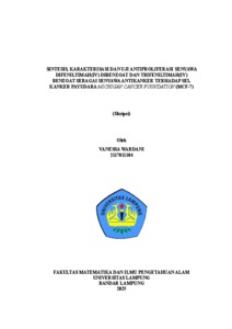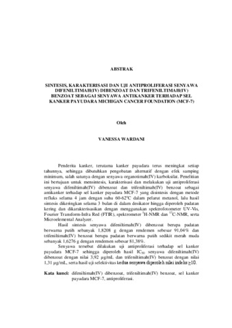 Penderita kanker, terutama kanker payudara terus meningkat setiap tahunnya, sehingga dibutuhkan pengobatan alternatif dengan efek samping minimum, salah satunya dengan senyawa organotimah(IV) karboksilat. Penelitian ini bertujuan untuk mensintesis, karakterisasi dan melakukan uji antiproliferasi senyawa difeniltimah(IV) dibenzoat dan trifeniltimah(IV) benzoat sebagai antikanker terhadap sel kanker payudara MCF-7 yang disintesis dengan metode refluks selama 4 jam dengan suhu 60-62oC dalam pelarut metanol, lalu hasil sintesis dikeringkan selama 3 bulan di dalam desikator hingga diperoleh padatan kering dan dikarakterisasikan dengan menggunakan spektrofotometer UV-Vis, Fourier Transform-Infra Red (FTIR), spektrometer 1H-NMR dan 13C-NMR, serta Microelemental Analyzer. Hasil sintesis senyawa difeniltimah(IV) dibenzoat berupa padatan berwarna putih sebanyak 1,8208 g dengan rendemen sebesar 91,04% dan trifeniltimah(IV) benzoat berupa padatan berwarna putih sedikit merah muda sebanyak 1,6276 g dengan rendemen sebesar 81,38%. Senyawa tersebut dilakukan uji antiproliferasi terhadap sel kanker payudara MCF-7 sehingga diperoleh hasil IC50 senyawa difeniltimah(IV) dibenzoat dengan nilai 3,92 μg/mL dan trifeniltimah(IV) benzoat dengan nilai 1,31 μg/mL, serta hasil uji selektivitas kedua senyawa diperoleh nilai indeks ≥10. Kata kunci: difeniltimah(IV) dibenzoat, trifeniltimah(IV) benzoat, sel kanker payudara MCF-7, antiproliferasi. The number of cancer patients, especially breast cancer patients, continues to increase every year, necessitating alternative treatments with minimal side effects, one of which involves organotin(IV) carboxylate compounds. This study aims to synthesize, characterize, and test the antiproliferative activity of diphenyltin(IV) dibenzoate and triphenyltin(IV) benzoate as anticancer agents against MCF-7 breast cancer cells. The compounds were synthesized using a reflux method for 4 hours at a temperature of 60–62°C in methanol solvent. The synthesized products were dried for 3 months in a desiccator until a dry solid was obtained and characterized using a UV-Vis spectrophotometer, Fourier Transform-Infrared (FTIR), 1H-NMR and 13C-NMR spectrometer, and a Microelemental Analyzer. The synthesis of diphenyltin(IV) dibenzoate yielded a white solid weighing 1.8208 g with a yield of 91.04%, and triphenyltin(IV) benzoate yielded a slightly pinkish white solid weighing 1.6276 g with a yield of 81.38%. The compounds were tested for antiproliferative activity against MCF-7 breast cancer cells, yielding IC50 values of 3.92 μg/mL for diphenyltin(IV) dibenzoate and 1.31 μg/mL for triphenyltin(IV) benzoate, with selectivity indices ≥10 for both compounds. Keywords: diphenyltin(IV) dibenzoate, triphenyltin(IV) benzoate, MCF-7 breast cancer cells, antiproliferation.