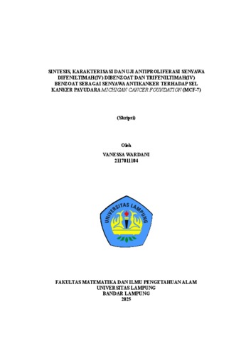 Vanessa, Wardani (2025) SINTESIS, KARAKTERISASI DAN UJI ANTIPROLIFERASI SENYAWA DIFENILTIMAH(IV) DIBENZOAT DAN TRIFENILTIMAH(IV) BENZOAT SEBAGAI SENYAWA ANTIKANKER TERHADAP SEL KANKER PAYUDARA MICHIGAN CANCER FOUNDATION (MCF-7). FAKULTAS MATEMATIKA DAN ILMU PENGETAHUAN ALAM, UNIVERSITAS LAMPUNG .