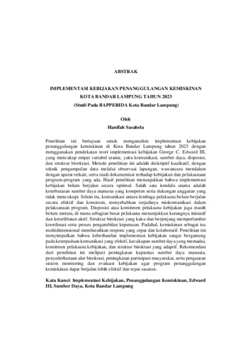 ABSTRAK Penelitian ini bertujuan untuk menganalisis implementasi kebijakan penanggulangan kemiskinan di Kota Bandar Lampung tahun 2023 dengan menggunakan pendekatan teori implementasi kebijakan George C. Edward III, yang mencakup empat variabel utama, yaitu komunikasi, sumber daya, disposisi, dan struktur birokrasi. Metode penelitian ini adalah deskriptif kualitatif, dengan teknik pengumpulan data melalui observasi lapangan, wawancara mendalam dengan aparat terkait, serta studi dokumentasi terhadap kebijakan dan pelaksanaan program-program yang ada. Hasil penelitian menunjukkan bahwa implementasi kebijakan belum berjalan secara optimal. Salah satu kendala utama adalah keterbatasan sumber daya manusia yang kompeten serta dukungan anggaran yang tidak mencukupi. Selain itu, komunikasi antara lembaga pelaksana belum berjalan secara efektif dan konsisten, menyebabkan terjadinya miskomunikasi dalam pelaksanaan program. Disposisi atau komitmen pelaksana kebijakan juga masih belum merata, di mana sebagian besar pelaksana menunjukkan kurangnya inisiatif dan keterlibatan aktif. Struktur birokrasi yang kaku dan berjenjang memperlambat koordinasi serta proses pengambilan keputusan. Padahal, kemiskinan sebagai isu multidimensional membutuhkan respons yang cepat dan kolaboratif. Penelitian ini menyimpulkan bahwa keberhasilan implementasi kebijakan sangat bergantung pada keterpaduan komunikasi yang efektif, kecukupan sumber daya yang memadai, komitmen pelaksana kebijakan, dan struktur birokrasi yang adaptif. Rekomendasi dari penelitian ini meliputi peningkatan kapasitas sumber daya manusia, penyederhanaan alur birokrasi, peningkatan partisipasi masyarakat, serta penguatan sistem monitoring dan evaluasi kebijakan agar program penanggulangan kemiskinan dapat berjalan lebih efektif dan tepat sasaran. Kata Kunci: Implementasi Kebijakan, Penanggulangan Kemiskinan, Edward III, Sumber Daya, Kota Bandar Lampung ABSTRACT This study aims to analyze the implementation of poverty alleviation policies in Bandar Lampung City in 2023 using George C. Edward III’s policy implementation theory, which emphasizes four main variables: communication, resources, disposition, and bureaucratic structure. The research employs a qualitative descriptive method, with data collected through field observation, in-depth interviews with relevant officials, and documentation of policy and program implementation. The findings indicate that the policy implementation has not been optimal. A key obstacle is the limited availability of competent human resources and insufficient budget allocation. Moreover, communication among implementing agencies is often ineffective and inconsistent, leading to miscoordination in program execution. The disposition or commitment of policy implementers also varies, with some showing a lack of initiative and active involvement. The bureaucratic structure is rigid and hierarchical, delaying coordination and decision-making processes. Given that poverty is a multidimensional issue, it requires rapid and collaborative responses. This study concludes that the success of policy implementation depends heavily on integrated and effective communication, adequate resource availability, strong implementer commitment, and a flexible bureaucratic structure. The study recommends strengthening human resource capacity, streamlining bureaucratic procedures, enhancing community participation, and reinforcing monitoring and evaluation systems. These improvements are essential to ensure that poverty alleviation programs are executed effectively, efficiently, and targeted to those who need them most. By addressing these critical factors, local governments can significantly reduce poverty levels and promote sustainable community welfare. Keywords: Policy Implementation, Poverty Alleviation, Edward III, Resources, Bandar Lampung City