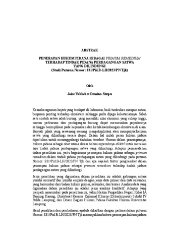 Joice Yokhebet Demina Sitepu , - (2025) PENERAPAN HUKUM PIDANA SEBAGAI PRIMUM REMEDIUM TERHADAP TINDAK PIDANA PERDAGANGAN SATWA YANG DILINDUNGI (Studi Putusan Nomor: 831/Pid.B-LH/2023/PN Tjk). FAKULTAS HUKUM, UNIVERSITAS LAMPUNG.