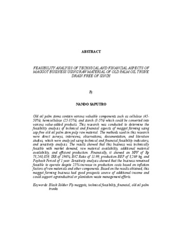 Batang kelapa sawit tua mengandung berbagai komponen berharga seperti selulosa (45-50%), hemiselulosa (25-35%), dan pati (3-5%) yang dapat dikonversi menjadi berbagai produk bernilai tambah. Penelitian ini dilakukan untuk mengetahui analisis kelayakan aspek teknis dan finansial usaha maggot berbahan baku ampas batang kelapa sawit tua bebas nira. Metode yang digunakan dalam penelitian ini adalah survei langsung, wawancara, observasi, dokumentasi, dan studi pustaka, serta dianalisis menggunakan indikator kelayakan teknis dan finansial, dan analisis sensitivitas. Hasil menunjukan bahwa usaha ini layak secara teknis dengan permintaan pasar, ketesediaan bahan baku, lalu ketersediaan bahan tambahan serta produksi yang efisien. Secara finansial dengan NPV sebesar Rp 73.240.859, IRR 196%, B/C Ratio 11,99, BEP produksi 3.269Kg, dan Payback Period selama 1 tahun. Analisis sensivitas menunjukan usaha tetap layak dijalankan meskipun terjadi kenaikan biaya produksi berdasarkan faktor inflasi bahan baku dan komponen lainnya sebesar 25%. Berdasarkan hasil yang diperoleh, usaha maggot ini memiliki prospek yang baik sebagai sumber pendapatan sampingan serta dapat mendukung upaya pengelolaan limbah agroindustri atau perkebunan. Kata kunci: Maggot Black Soldier Fly, kelayakan teknis, finansial, batang kelapa sawit tua. Old oil palm stems contain various valuable components such as cellulose (45- 50%), hemicellulose (25-35%), and starch (3-5%) which could be converted into various value-added products. This research was conducted to determine the feasibility analysis of technical and financial aspects of maggot farming using sap-free old oil palm stem pulp raw material. The methods used in this research were direct surveys, interviews, observations, documentation, and literature studies, which were analyzed using technical and financial feasibility indicators, and sensitivity analysis. The results showed that this business was technically feasible with market demand, raw material availability, additional material availability, and efficient production. Financially, it showed an NPV of Rp 73,240,859, IRR of 196%, B/C Ratio of 11.99, production BEP of 3,269 kg, and Payback Period of 1 year. Sensitivity analysis showed that the business remained feasible to operate despite 25% increase in production costs based on inflation factors of raw materials and other components. Based on the results obtained, this maggot farming business had good prospects source of additional income and could support agroindustrial or plantation waste management efforts. Keywords: Black Soldier Fly maggots, technical feasibility, financial, old oil palm trunks