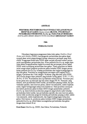 PERFORMA PERTUMBUHAN DAN TINGKAT KELANGSUNGAN HIDUP IKAN GABUS Channa striata (BLOCH, 1793) DENGAN PENAMBAHAN PROBIOTIK Bacillus sp. PADA PAKAN BERBASIS DISTILLERS DRIED GRAINS WITH SOLUBLES (DDGS) DAN TAURIN