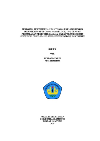 PERDANA , FAUZI (2025) PERFORMA PERTUMBUHAN DAN TINGKAT KELANGSUNGAN HIDUP IKAN GABUS Channa striata (BLOCH, 1793) DENGAN PENAMBAHAN PROBIOTIK Bacillus sp. PADA PAKAN BERBASIS DISTILLERS DRIED GRAINS WITH SOLUBLES (DDGS) DAN TAURIN. FAKULTAS PERTANIAN, UNIVERSITAS LAMPUNG.