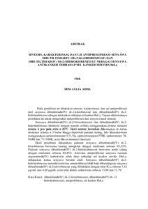 Pada penelitian ini dilakukan sintesis, karakterisasi, dan uji antiproliferasi dari senyawa dibutiltimah(IV) di-2-klorobenzoat dan dibutiltimah(IV) di-2- hidroksibenzoat sebagai antikanker terhadap sel kanker HeLa. Tujuan dilakukannya penelitian ini untuk mengetahui antiproliferasi dari senyawa hasil sintesis. Senyawa dibutiltimah(IV) di-(2-klorobenzoat) dan dibutiltimah(IV) di-2- hidroksibenzoat disintesis dengan metode refluks menggunakan pelarut metanol selama 4 jam pada suhu ± 60°C. Hasil sintesis kemudian dikeringkan di dalam desikator selama ± 3 bulan hingga diperoleh padatan kering, lalu dikarakterisasi menggunakan spektrofotometer UV-Vis, spektrofotometer FTIR, spektrometer 1H- NMR dan 13C-NMR, serta Microelemental Analyzer. Hasil penelitian didapatkan padatan senyawa dibutiltimah(IV) di-2- klorobenzoat berwarna kuning mengkilat dengan rendemen sebesar 93,55%. Padatan senyawa dibutiltimah(IV) di-2-hidroksibenzoat berwarna putih tulang dengan rendemen sebesar 84,45%. Aktivitas antiproliferasi senyawa turunan organotimah(IV) karboksilat telah diuji terhadap sel kanker serviks HeLa, didapatkan kedua senyawa bersifat aktif. Senyawa dibutiltimah(IV) di-2- hidroksibenzoat memiliki aktivitas antiproliferasi lebih baik dibandingkan senyawa dibutiltimah(IV) di-2-klorobenzoat yang dibuktikan dengan nilai IC50 sebesar 3,52 μg/mL dan 4,48 μg/mL serta nilai indeks selektivitas sebesar 13,89 dan 13,79. Kata Kunci: dibutiltimah(IV) di-(2-klorobenzoat), dibutiltimah(IV) di- (2- hidroksibenzoat), antiproliferasi, sel kanker HeLa In this study, synthesis, characterization, and antiproliferation tests were carried out on the compounds dibutyltin(IV) di-2-chlorobenzoate and dibutyltin(IV) di-2- hydroxybenzoate as anticancer agents against HeLa cancer cells. The purpose of this study was to determine the antiproliferation of the synthesized compounds. Compounds dibutyltin(IV) di-2-chlorobenzoate and dibutyltin(IV) di-2- hydroxybenzoate were synthesized by the reflux method using methanol solvent for 4 hours at a temperature of ± 60°C. The synthesis results were then dried in a desiccator for ± 3 months until a dry solid was obtained, then characterized using a UV-Vis spectrophotometer, FTIR spectrophotometer, 1H-NMR and 13C-NMR spectrometers, and Microelemental Analyzer. The results of the study obtained a solid compound of dibutyltin(IV) di-(2-chlorobenzoate) which was shiny yellow with a yield of 93.55%. The solid compound of dibutyltin(IV) di-2- hydroxybenzoate was bone white with a yield of 84.45%. The antiproliferative activity of organotin(IV) carboxylate derivative compounds has been tested against HeLa cervical cancer cells, both compounds were found to be active. The compound of dibutyltin(IV) di-2-hydroxybenzoate has better antiproliferative activity than the compound of dibutyltin(IV) di-2-chlorobenzoate which is evidenced by the IC50 value of 3.52 μg/mL and 4.48 μg/mL and the selectivity index value of 13.89 and 13.79. Keywords: dibutyltin(IV) di-(2-chlorobenzoate), dibutyltin(IV) di-(2- hydroxybenzoate), antiproliferative, HeLa cancer cells