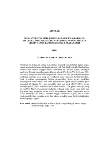 DIASWARA , SATRIA DIRGANTARA (2025) KARAKTERISTIK FISIK BIODEGRADABLE FILM BERBASIS SELULOSA AMPAS BONGGOL NANAS DENGAN PENAMBAHAN LIGNIN AMPAS TANDAN KOSONG KELAPA SAWIT. FAKULTAS PERTANIAN, UNIVERSITAS LAMPUNG.
