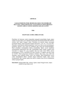 ABSTRAK Penelitian ini bertujuan untuk mengetahui pengaruh penambahan lignin ampas tandan kosong kelapa sawit terhadap karakteristik fisik biodegradable film berbasis selulosa dari ampas bonggol nanas. Penelitian ini disusun dalam rancangan kuadruplo dengan variasi konsentrasi lignin sebesar 0%, 2,5%, 5%, 7,5%, dan 10%. Parameter yang diamati adalah pengamatan visual, kuat tarik, persen pemanjangan, ketebalan, densitas, daya serap air, ketahanan suhu ruang dan biodegradabilitas. Hasil penelitian menunjukkan bahwa penambahan lignin secara signifikan memengaruhi karakteristik fisik film. Penambahan lignin terbaik terdapat pada formulasi L2 (lignin 5%) yang memiliki nilai kuat tarik (20,27 MPa), persen pemanjangan (15,29%), ketebalan (0,29 mm), densitas (1,16 g⁄cm3) dan daya serap air (6,28%). Hasil pengamatan ketahanan terhadap suhu ruang yang stabil dan degradasi yang sempurna dalam waktu satu minggu. Hasil pengamatan secara visual menunjukkan bahwa semakin tinggi konsentrasi lignin, maka warna biodegradable film semakin gelap dan tekstur semakin kasar hal ini diakibatkan adanya agregasi lignin. Kata kunci: biodegradable film, selulosa, lignin, ampas bonggol nanas, ampas tandan kosong kelapa sawit ABSTRACT This study aims to determine the effect of lignin addition from palm empty fruit bunches on the physical characteristics of cellulose-based biodegradable film from pineapple pulp. This study was arranged in a quadruplicate design with variations in lignin concentration of 0%, 2.5%, 5%, 7.5%, and 10%. The parameters observed were visual observation, tensile strength, percent elongation, thickness, density, water absorption, room temperature resistance and biodegradability. The results showed that the addition of lignin significantly affected the physical characteristics of the film. The best lignin addition was found in formulation L2 (5% lignin) which had tensile strength (20.27 MPa), percent elongation (15.29%), thickness (0.29 mm), density (1.16 g⁄cm3) and water absorption (6.28%). The observation results were stable room temperature resistance and complete degradation within one week. Visual observation showed that the higher the lignin concentration, the darker the color of the biodegradable film and the coarser the texture due to lignin aggregation. Keywords: biodegradable film, cellulose, lignin, pineapple pulp, oil palm empty fruit bunch pulp