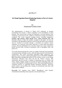 Penerapan teknologi Internet of Things (IoT) di lingkungan rumah sakit telah menjadi bagian penting dalam pengembangan konsep smart hospital. Penelitian ini bertujuan untuk merancang dan mengimplementasikan sistem monitoring ruang rawat inap berbasis IoT yang mampu memantau kondisi lingkungan secara real- time. Sistem ini mengintegrasikan beberapa sensor, termasuk sensor suhu, kelembapan, intensitas cahaya, karbon dioksida (CO2), karbon monoksida (CO), dan sensor ultrasonik untuk mendeteksi jumlah orang di dalam ruangan. Seluruh data dikirimkan ke platform ThingsBoard melalui koneksi Wi-Fi menggunakan mikrokontroler ESP32 dan ditampilkan secara real-time dalam antarmuka web. Proses kalibrasi dilakukan menggunakan metode regresi linier untuk meningkatkan akurasi pembacaan sensor. Selain itu, uji kinerja jaringan dilakukan untuk mengevaluasi kualitas konektivitas antar node, mencakup parameter throughput, delay, dan packet loss. Hasil pengujian menunjukkan bahwa sistem mampu mendeteksi dan mengirimkan data lingkungan dengan akurasi tinggi, serta memberikan visualisasi yang responsif dan informatif. Sistem berhasil menjaga konektivitas stabil dalam jarak hingga 12 meter, nilai throughput yang diperoleh 135.545,9 hingga 165.887,9 Bytes.Sementara itu, seluruh sesi pengujian nilai packet loss tidak terdapat kehilangan data selama proses transmisi berlangsung. Dengan demikian, kedua nilai ini berada pada kategori “Perfect”, Hal ini menunjukkan bahwa jaringan mampu mengirimkan data dengan sangat cepat dan stabil, sehingga sangat sesuai untuk kebutuhan pemantauan secara real time berbasis IoT. Sistem juga mampu menghitung orang dalam ruangan. Implementasi sistem ini dinilai efektif dalam mendukung efisiensi operasional rumah sakit, meningkatkan kenyamanan pasien, serta memberikan peringatan dini terhadap risiko lingkungan yang dapat mempengaruhi kondisi pasien. Kata Kunci: IoT, ruang rawat inap, ESP32, ThingsBoard, smart hospital, monitoring lingkungan, regresi linier, kualitas jaringan. The implementation of Internet of Things (IoT) technology in hospital environments has become a critical component in the development of smart hospitals. This research aims to design and implement a real-time inpatient room monitoring system based on IoT, capable of continuously tracking environmental conditions. The system integrates multiple sensors, including temperature, humidity, light intensity, carbon dioxide (CO2), carbon monoxide (CO), and ultrasonic sensors to detect the number of people in the room. All data are transmitted to the ThingsBoard platform via Wi-Fi using the ESP32 microcontroller and are visualized in real-time through a web-based user interface. Sensor calibration was conducted using linear regression to ensure high measurement accuracy. Network performance tests were also carried out to assess connectivity quality between nodes, focusing on parameters such as throughput, delay, and packet loss. Test results demonstrated that the system was capable of detecting and transmitting environmental data with high accuracy, while providing responsive and informative visualizations. The system successfully maintained stable connectivity over distances of up to 12 meters, achieving throughput values of 135,545.9 to 165,887.9 Bytes. Meanwhile, throughout the packet loss test sessions, no data was lost during transmission. Therefore, both values fall into the "Perfect" category. This demonstrates that the network is capable of transmitting data very quickly and stably, making it highly suitable for real-time IoT-based monitoring needs. The system is also capable of counting people in rooms. This system implementation is considered effective in supporting hospital operational efficiency, improving patient comfort, and providing early warning of environmental risks that could impact patient condition. Keywords: IoT, inpatient room, ESP32, ThingsBoard, smart hospital, environmental monitoring, linear regression, network performance.