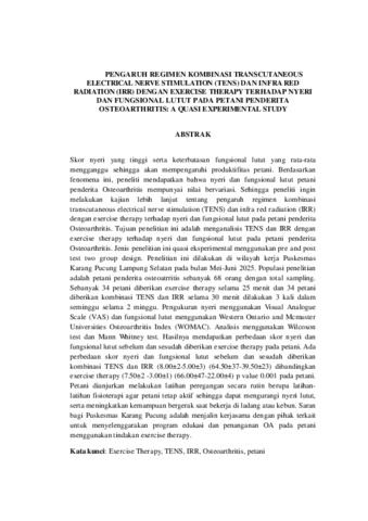 Skor nyeri yang tinggi serta keterbatasan fungsional lutut yang rata-rata mengganggu sehingga akan mempengaruhi produktifitas petani. Berdasarkan fenomena ini, peneliti mendapatkan bahwa nyeri dan fungsional lutut petani penderita Osteoarthritis mempunyai nilai bervariasi. Sehingga peneliti ingin melakukan kajian lebih lanjut tentang pengaruh regimen kombinasi transcutaneous electrical nerve stimulation (TENS) dan infra red radiation (IRR) dengan exercise therapy terhadap nyeri dan fungsional lutut pada petani penderita Osteoarthritis. Tujuan penelitian ini adalah menganalisis TENS dan IRR dengan exercise therapy terhadap nyeri dan fungsional lutut pada petani penderita Osteoarthritis. Jenis penelitian ini quasi eksperimental menggunakan pre and post test two group design. Penelitian ini dilakukan di wilayah kerja Puskesmas Karang Pucung Lampung Selatan pada bulan Mei-Juni 2025. Populasi penelitian adalah petani penderita osteoatrritis sebanyak 68 orang dengan total sampling. Sebanyak 34 petani diberikan exercise therapy selama 25 menit dan 34 petani diberikan kombinasi TENS dan IRR selama 30 menit dilakukan 3 kali dalam seminggu selama 2 minggu. Pengukuran nyeri menggunakan Visual Analogue Scale (VAS) dan fungsional lutut menggunakan Western Ontario and Mcmaster Universities Osteoarthritis Index (WOMAC). Analisis menggunakan Wilcoxon test dan Mann Whitney test. Hasilnya mendapatkan perbedaan skor nyeri dan fungsional lutut sebelum dan sesudah diberikan exercise therapy pada petani. Ada perbedaan skor nyeri dan fungsional lutut sebelum dan sesudah diberikan kombinasi TENS dan IRR (8.00±2-5.00±3) (64.50±37-39.50±23) dibandingkan exercise therapy (7.50±2 -3.00±1) (66.00±47-22.00±4) p value 0.001 pada petani. Petani dianjurkan melakukan latihan peregangan secara rutin berupa latihan- latihan fisioterapi agar petani tetap aktif sehingga dapat mengurangi nyeri lutut, serta meningkatkan kemampuan bergerak saat bekerja di ladang atau kebun. Saran bagi Puskesmas Karang Pucung adalah menjalin kerjasama dengan pihak terkait untuk menyelenggarakan program edukasi dan penanganan OA pada petani menggunakan tindakan exercise therapy. Kata kunci: Exercise Therapy, TENS, IRR, Osteoarthritis, petani High pain scores and limited knee function often interfere with the productivity of farmers with osteoarthritis (OA). This study aimed to analyze the effects of a combined regimen of Transcutaneous Electrical Nerve Stimulation (TENS) and Infrared Radiation (IRR) with exercise therapy on pain and knee function in farmers with OA. This quasi-experimental study used a pre- and post-test two- group design, conducted in May–June 2025 at the Karang Pucung Public Health Center, South Lampung. A total of 68 farmers with OA were selected through total sampling. Thirty-four participants received exercise therapy for 25 minutes, and the other 34 received a combination of TENS and IRR for 30 minutes, three times a week for two weeks. Pain was measured using the Visual Analogue Scale (VAS), and knee function was assessed using the Western Ontario and McMaster Universities Osteoarthritis Index (WOMAC). Data were analyzed using the Wilcoxon and Mann-Whitney tests. The results showed significant differences in pain and knee function scores before and after both interventions. Exercise therapy showed greater improvement (pain score: 7.50±2 to 3.00±1; function score: 66.00±47 to 22.00±4) compared the combination of TENS and IRR (pain score: 8.00±2 to 5.00±3; function score: 64.50±37 to 39.50±23), with a p-value of 0.001. It is recommended that farmers perform regular physiotherapy-based stretching exercises to reduce pain and improve mobility. The health center is advised to collaborate with stakeholders in implementing educational and therapeutic programs for OA management among farmers. Keywords: Exercise therapy, TENS, IRR, Osteoarthritis, farmers