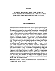 ABSTRAK Media sosial telah menjadi saluran komunikasi utama dalam menyampaikan informasi perusahaan untuk membangun citra, menyampaikan aktivitas korporasi, hingga menjangkau khalayak yang lebih luas. Penelitian ini berdasarkan pengalaman penulis saat magang di PT United Tractors Tbk, yang mengelola akun Instagram Cerita di United Tractors. Namun, efektivitas akun tersebut dalam memenuhi kebutuhan informasi khalayak belum efisien dalam melakukan evaluasi laporan kepuasan khalayak. Penelitian ini bertujuan untuk mengetahui seberapa besar pengaruh penggunaan media sosial Instagram Cerita di United Tractors terhadap kepuasan dalam pemenuhan kebutuhan informasi followers-nya. Penelitian ini menggunakan teori Uses and Gratifications dengan pendekatan kuantitatif melalui survei terhadap 100 responden menggunakan rumus Slovin. Hasil perhitungan regresi linear sederhana menunjukkan bahwa persamaan regresi yang diperoleh adalah Y = 38,801 + 1,227X, yang berarti penggunaan media sosial Instagram berpengaruh positif terhadap kepuasan informasi followers. Berdasarkan hasil uji hipotesis, diperoleh nilai t hitung lebih besar dari t tabel (12,286 > 1,984), sehingga H1 diterima dan H0 ditolak, yang berarti terdapat pengaruh signifikan antara penggunaan Instagram Cerita di United Tractors terhadap kepuasan informasi penggunanya. Koefisien determinasi sebesar 0,620 menunjukkan bahwa 62,0% variabel kepuasan informasi dapat dijelaskan oleh penggunaan Instagram tersebut, sedangkan 38,0% sisanya dipengaruhi oleh faktor lain yang tidak diteliti dalam penelitian ini. Dengan demikian, penggunaan Instagram sebagai media informasi terbukti berperan dalam memenuhi kebutuhan kognitif, afektif, sosial, dan personal pengguna. Kata kunci: Instagram, Kepuasan Informasi, Media Sosial, Uses and Gratifications, Cerita di United Tractors, Followers. ABSTRACT Social media has become a primary communication channel for companies to deliver information, build brand image, share corporate activities, and reach a broader audience. This study is based on the author's experience during an internship at PT United Tractors Tbk, which manages the Instagram Stories account for United Tractors. However, the effectiveness of the account in meeting the informational needs of the audience has not been efficiently evaluated in terms of satisfaction reporting. This study aims to assess the impact of using Instagram Stories at United Tractors on follower satisfaction in fulfilling their informational needs. This research uses the Uses and Gratifications theory with a quantitative approach through a survey of 100 respondents, using the Slovin formula. The results of the simple linear regression analysis show the regression equation Y = 38.801 + 1.227X, indicating that the use of Instagram positively affects followers’ information satisfaction. Based on the hypothesis test, the result shows that the t-count is greater than the t-table (12.286 > 1.984), thus H1 is accepted and H0 is rejected, meaning there is a significant influence between the use of Instagram Cerita di United Tractors and user satisfaction in fulfilling their information needs. The coefficient of determination (R Square) is 0.620, indicating that 62.0% of the variation in information satisfaction is explained by Instagram usage, while the remaining 38.0% is influenced by other factors not examined in this study. Therefore, the use of Instagram as an information medium is proven to play a role in fulfilling users' cognitive, affective, social, and personal needs, as explained in the Uses and Gratifications theory. Keywords: Instagram, Information Satisfaction, Social Media, Uses and Gratifications, Cerita di United Tractors, Followers.