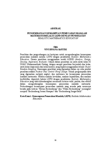 ABSTRAK Penelitian dan pengembangan ini bertujuan untuk mengembangkan kemampuan pemecahan masalah melalui LKPD dengan pendekatan Realistic Mathematics Education. Desain penelitian menggunakan model ADDIE (Analyze, Design, Develop, Implement, Evaluate). Subjek dalam penelitian ini yaitu siswa kelas XI SMAS Muhammadiyah Gisting, dengan sampel penelitian berjumlah dua kelas, yaitu kelas eksperimen dan kelas kontrol, yang dipilih menggunakan teknik Cluster Random Sampling. Rancangan penelitian yang digunakan dalam uji coba produk penelitian adalah Posttest Only Control Group Design. Teknik pengumpulan data yang digunakan meliputi angket, dan instrumen tes kemampuan pemecahan masalah matematis. Melalui analisis kevalidan, analisis kepraktisan, dan analisis keefektifan, diperoleh bahwa LKPD dengan pendekatan Realistic Mathematics Education yang telah dikembangkan memenuhi kriteria valid, praktis, dan efektif dalam mengembangkan kemampuan pemecahan masalah matematis. Perkembangan kemampuan pemecahan masalah yang semula pada umumnya berada pada kriteria “Belum Berkembang” dan “Mulai Berkembang” meningkat menjadi “Berkembang Sesuai Harapan” dan “Berkembang Sangat Baik”. Kata Kunci : Kemampuan Pemecahan Masalah, LKPD, Realistic Mathematics Education ABSTRACT This research and development aims to develop problem-solving skills through LKPD with the Realistic Mathematics Education approach. The research design uses the ADDIE model (Analyze, Design, Develop, Implement, Evaluate). The subjects in this study were students of class XI SMAS Muhammadiyah Gisting, with a research sample of two classes, namely the experimental class and the control class, which were selected using the Cluster Random Sampling technique. The research design used in the trial of the research product was the Posttest Only Control Group Design. Data collection techniques used included questionnaires and mathematical problem-solving ability test instruments. Through validity analysis, practicality analysis, and effectiveness analysis, it was obtained that LKPD with the Realistic Mathematics Education approach that had been developed met the criteria of valid, practical, and effective in developing mathematical problem-solving skills. The development of problem-solving skills which were initially generally in the criteria of "Not Developing" and "Starting to Develop" increased to "Developing According to Expectations" and "Developing Very Well". Keywords: LKPD, Problem Solving Ability, Realistic Mathematics Education