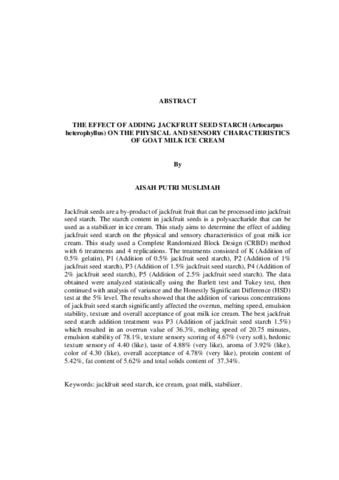 ABSTRACT Jackfruit seeds are a by-product of jackfruit fruit that can be processed into jackfruit seed starch. The starch content in jackfruit seeds is a polysaccharide that can be used as a stabilizer in ice cream. This study aims to determine the effect of adding jackfruit seed starch on the physical and sensory characteristics of goat milk ice cream. This study used a Complete Randomized Block Design (CRBD) method with 6 treatments and 4 replications. The treatments consisted of K (Addition of 0.5% gelatin), P1 (Addition of 0.5% jackfruit seed starch), P2 (Addition of 1% jackfruit seed starch), P3 (Addition of 1.5% jackfruit seed starch), P4 (Addition of 2% jackfruit seed starch), P5 (Addition of 2.5% jackfruit seed starch). The data obtained were analyzed statistically using the Barlett test and Tukey test, then continued with analysis of variance and the Honestly Significant Difference (HSD) test at the 5% level. The results showed that the addition of various concentrations of jackfruit seed starch significantly affected the overrun, melting speed, emulsion stability, texture and overall acceptance of goat milk ice cream. The best jackfruit seed starch addition treatment was P3 (Addition of jackfruit seed starch 1.5%) which resulted in an overrun value of 36.3%, melting speed of 20.75 minutes, emulsion stability of 78.1%, texture sensory scoring of 4.67% (very soft), hedonic texture sensory of 4.40 (like), taste of 4.88% (very like), aroma of 3.92% (like), color of 4.30 (like), overall acceptance of 4.78% (very like), protein content of 5.42%, fat content of 5.62% and total solids content of 37.34%. Keywords: jackfruit seed starch, ice cream, goat milk, stabilizer. ABSTRAK Biji nangka merupakan hasil samping buah nangka yang dapat diolah menjadi pati biji nangka. Kandungan pati pada biji nangka merupakan polisakarida yang dapat dijadikan sebagai penstabil pada es krim. Penelitian ini bertujuan untuk mengenai pengaruh penambahan pati biji nangka terhadap karakteristik fisik dan sensori es krim susu kambing. Penelitian ini menggunakan metode Rancangan Acak Kelompok Lengkap (RAKL) dengan 6 perlakuan dan 4 ulangan. Perlakuan terdiri dari K (Penambahan gelatin 0,5%), P1 (Penambahan pati biji nangka 0,5%), P2 (Penambahan pati biji nangka 1%), P3 (Penambahan pati biji nangka 1,5%), P4 (Penambahan pati biji nangka 2%), P5 (Penambahan pati biji nangka 2,5%). Data yang diperoleh dianalisis secara statistik menggunakan uji Barlett dan uji Tukey lalu dilanjutkan dengan analisis ragam dan uji Beda Nyata Jujur (BNJ) pada taraf 5%. Hasil penelitian menunjukkan bahwa perlakuan penambahan berbagai konsentrasi pati biji nangka berpengaruh nyata terhadap overrun, kecepetan leleh, stabilitas emulsi, tekstur dan penerimaan keseluruhan es krim susu kambing. Perlakuan penambahan pati biji nangka terbaik adalah P3 (Penambahan pati biji nangka 1,5%) yang menghasilkan nilai overrun 36,3%, kecepatan leleh 20,75 menit, stabilitas emulsi 78,1%, sensori skoring tekstur 4,67% (sangat lembut), sensori hedonik tekstur 4,40 (suka), rasa 4,88% (sangat suka), aroma 3,92% (suka), warna 4,30 (suka), penerimaan keseluruhan 4,78% (sangat suka), kadar protein 5,42%, kadar lemak 5,62% dan kadar total padatan 37,34%. Kata kunci: pati biji nangka, es krim, susu kambing, penstabil.
