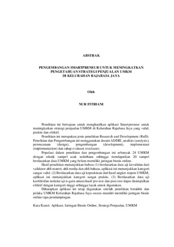 Nur , Fitriani (2025) PENGEMBANGAN SMARTPRENEUR UNTUK MENINGKATKAN PENGETAHUAN STRATEGI PENJUALAN UMKM DI KELURAHAN RAJABASA JAYA. FAKULTAS KEGURUAN DAN ILMU PENDIDIKAN, UNIVERSITAS LAMPUNG.