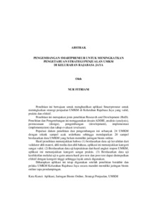 Penelitian ini bertujuan untuk menghasilkan aplikasi Smartpreneur untuk meningkatkan strategi penjualan UMKM di Kelurahan Rajabasa Jaya yang valid, praktis dan efektif. Penelitian ini merupakan jenis penelitian Research and Development (RnD). Penelitian dan Pengembangan ini menggunakan desain ADDIE, analisis (analysis), perencanaan (design), pengembangan (development), implementasi (implementation) dan tahap evaluasi (evaluate). Populasi dalam penelitian dan pengembangan ini sebanyak 24 UMKM dengan teknik sampel acak sederhana sehingga mendapatkan 20 sampel berdasarkan data UMKM yang belum memiliki jaringan bisnis online. Hasil penelitian menunjukkan bahwa (1) berdasarkan data uji kevalidan dari validator ahli materi, ahli media dan ahli bahasa, aplikasi ini menunjukkan kategori sangat valid. (2) Berdasarkan data uji kepraktisan dari hasil angket respon UMKM, aplikasi ini menunjukkan kategori sangat praktis. (3) Berdasarkan data uji keefektifan melalui uji n-gain antara hasil pre-test dan post-test dapat disimpulkan efektif dengan kategori tinggi sehingga layak untuk digunakan. Diharapkan aplikasi ini tetap digunakan setelah penelitian berakhir dan pelaku UMKM Kelurahan Rajabasa Jaya secara mandiri memiliki jaringan bisnis online tapa pendampingan. Kata Kunci: Aplikasi, Jaringan Bisnis Online, Strategi Penjualan, UMKM This study aims to produce a Smartpreneur application to improve the sales strategy of UMKM in Rajabasa Jaya Village that is valid, practical and effective. This research is a type of Research and Development (RnD) research. This Research and Development uses ADDIE design, analysis, planning (design), development (development), implementation (implementation) and evaluation stages (evaluate). The population in this research and development was 24 UMKM with a simple random sampling technique so that 20 samples were obtained based on UMKM data that did not yet have an online business network. The results of the study showed that (1) based on validity test data from material expert validators, media experts and language experts, this application shows a very valid category. (2) Based on practicality test data from the results of the UMKM response questionnaire, this application shows a very practical category. (3) Based on effectiveness test data through the n-gain test between the pre-test and post-test results, it can be concluded that it is effective with a high category so that it is feasible to use. It is hoped that this application will continue to be used after the research ends and that UMKM actors in Rajabasa Jaya Village will independently have an online business network without assistance. Key words: Application, Online Business Network, Sales Strategy, UMKM