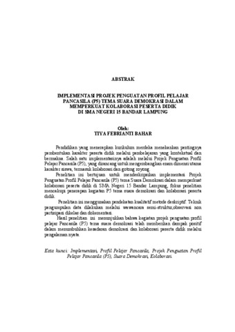 ABSTRAK Pendidikan yang menerapkan kurikulum merdeka menekankan pentingnya pembentukan karakter peserta didik melalui pembelajaran yang kontekstual dan bermakna. Salah satu implementasinya adalah melalui Projek Penguatan Profil Pelajar Pancasila (P5), yang dirancang untuk mengembangkan enam dimensi utama karakter siswa, termasuk kolaborasi dan gotong royong. Penelitian ini bertujuan untuk mendeskripsikan implementasi Projek Penguatan Profil Pelajar Pancasila (P5) tema Suara Demokrasi dalam memperkuat kolaborasi peserta didik di SMA Negeri 15 Bandar Lampung, fokus penelitian mencakupi penerapan kegiatan P5 tema suara demokrasi dan kolaborasi peserta didik. Penelitian ini menggunakan pendekatan kualitatif metode deskriptif. Teknik pengumpulan data dilakukan melalui wawancara semi-struktur,observasi non partisipasi dikelas dan dokementasi. Hasil penelitian ini menunjukkan bahwa kegiatan projek penguatan profil pelajar Pancasila (P5) tema suara demokrasi telah memberikan dampak positif dalam menumbuhkan kesadaran demokrasi dan kolaborasi peserta didik melalui pengalaman nyata. Kata kunci: Implementasi, Profil Pelajar Pancasila, Projek Penguatan Profil Pelajar Pancasila (P5), Suara Demokrasi, Kolaborasi. ABSTRACT Education that implements the independent curriculum emphasizes the importance of character building for students through contextual and meaningful learning. One of its implementations is through the Pancasila Student Profile Strengthening Project (P5), which is designed to develop six main dimensions of student character, including collaboration and mutual cooperation. This study aims to describe the implementation of the Pancasila Student Profile Strengthening Project (P5) with the theme of Democracy Voice in strengthening student collaboration at SMA Negeri 15 Bandar Lampung, the focus of the study includes the implementation of P5 activities with the theme of democracy voice and student collaboration.This study uses a qualitative descriptive method approach. Data collection techniques are carried out through semi-structured interviews, non- participatory observations in class and documentation. The results of this study indicate that the Pancasila student profile strengthening project (P5) with the theme of democracy voice has had a positive impact on fostering democratic awareness and student collaboration through real experiences. Keywords: Implementation, Pancasila Student Profile, Pancasila Student Profile Strengthening Project (P5), Voice of Democracy, Collaboration.